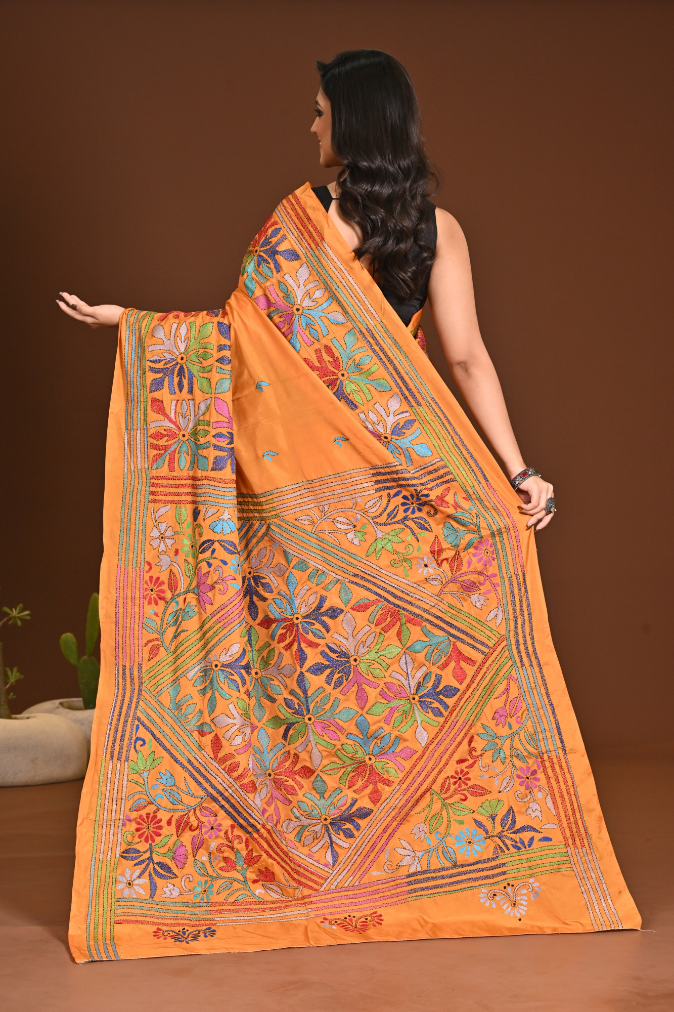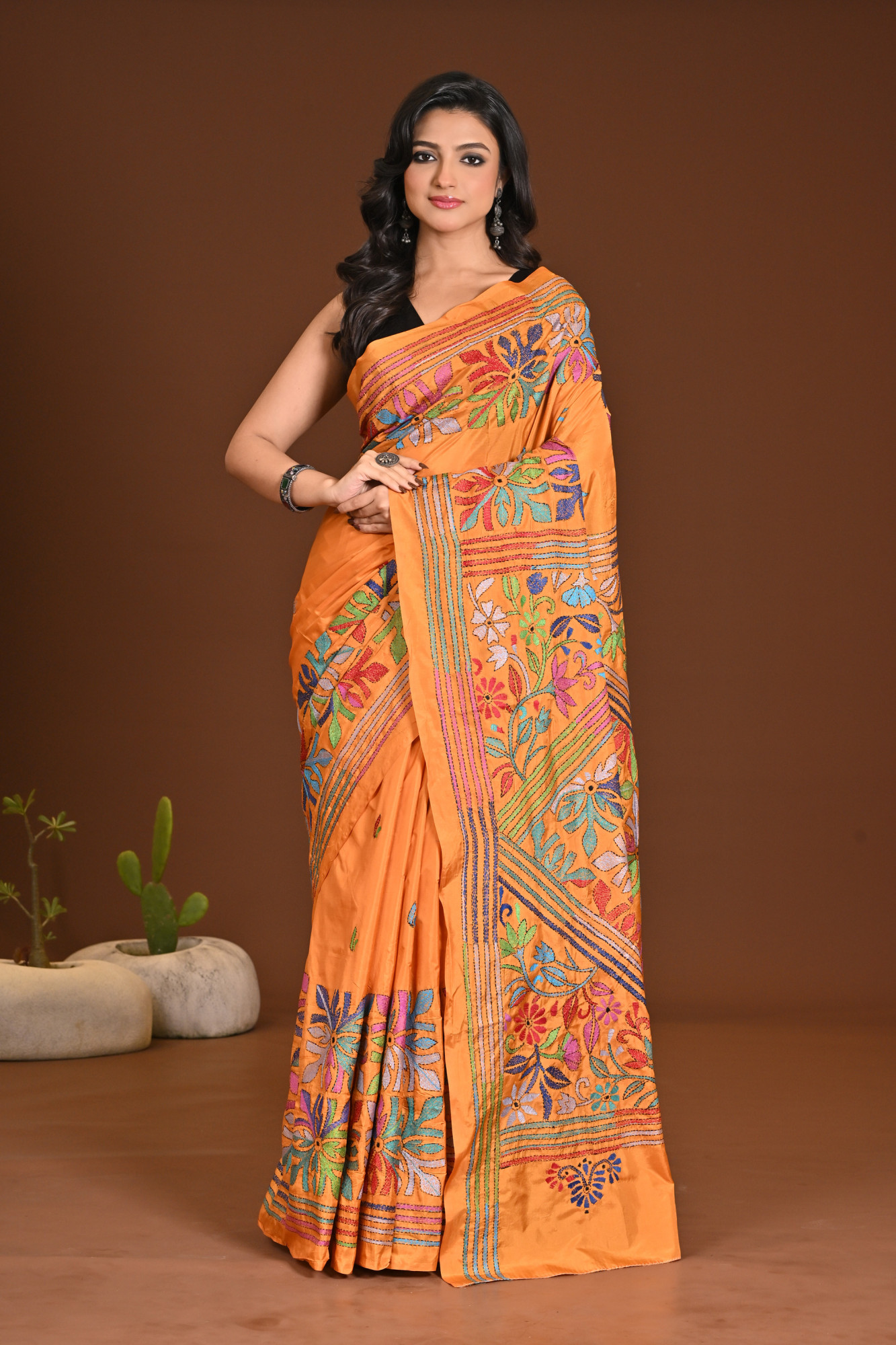 Zari : A blended silk Kantha saree is a traditional Indian saree crafted from a mix of silk and other fibers, adorned with Kantha embroidery—a hand-stitched technique originating from Bengal. These sarees are known for their lightweight drape, smooth texture, and intricate, often storytelling motifs stitched in fine running stitches. The blend of silk gives it a soft sheen and elegance, making it a perfect choice for both festive and casual occasions.