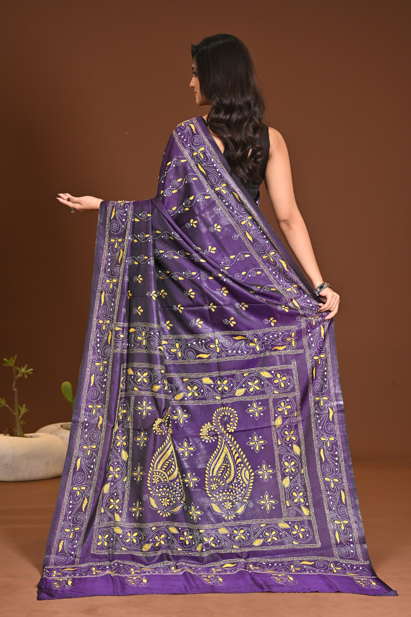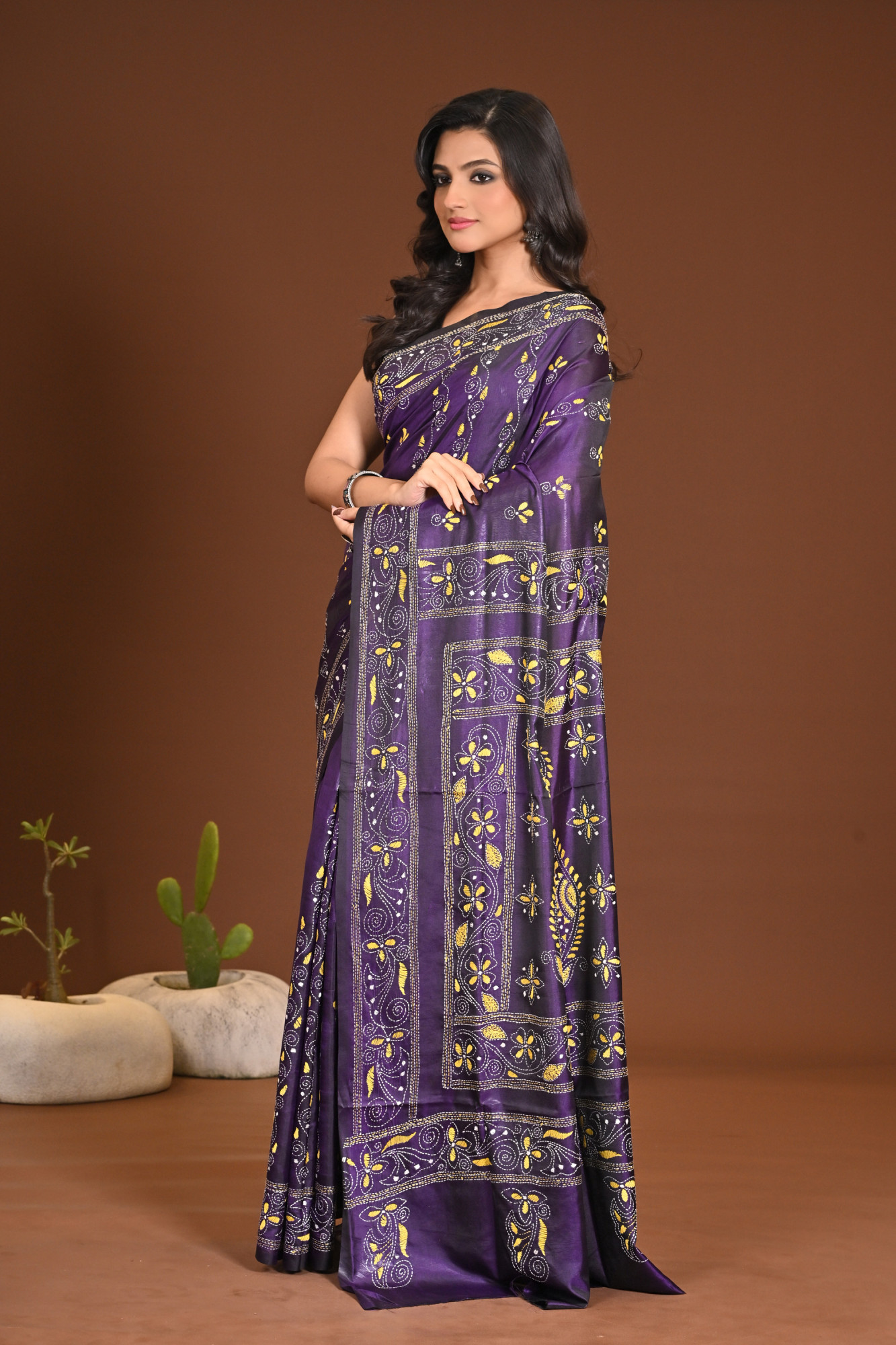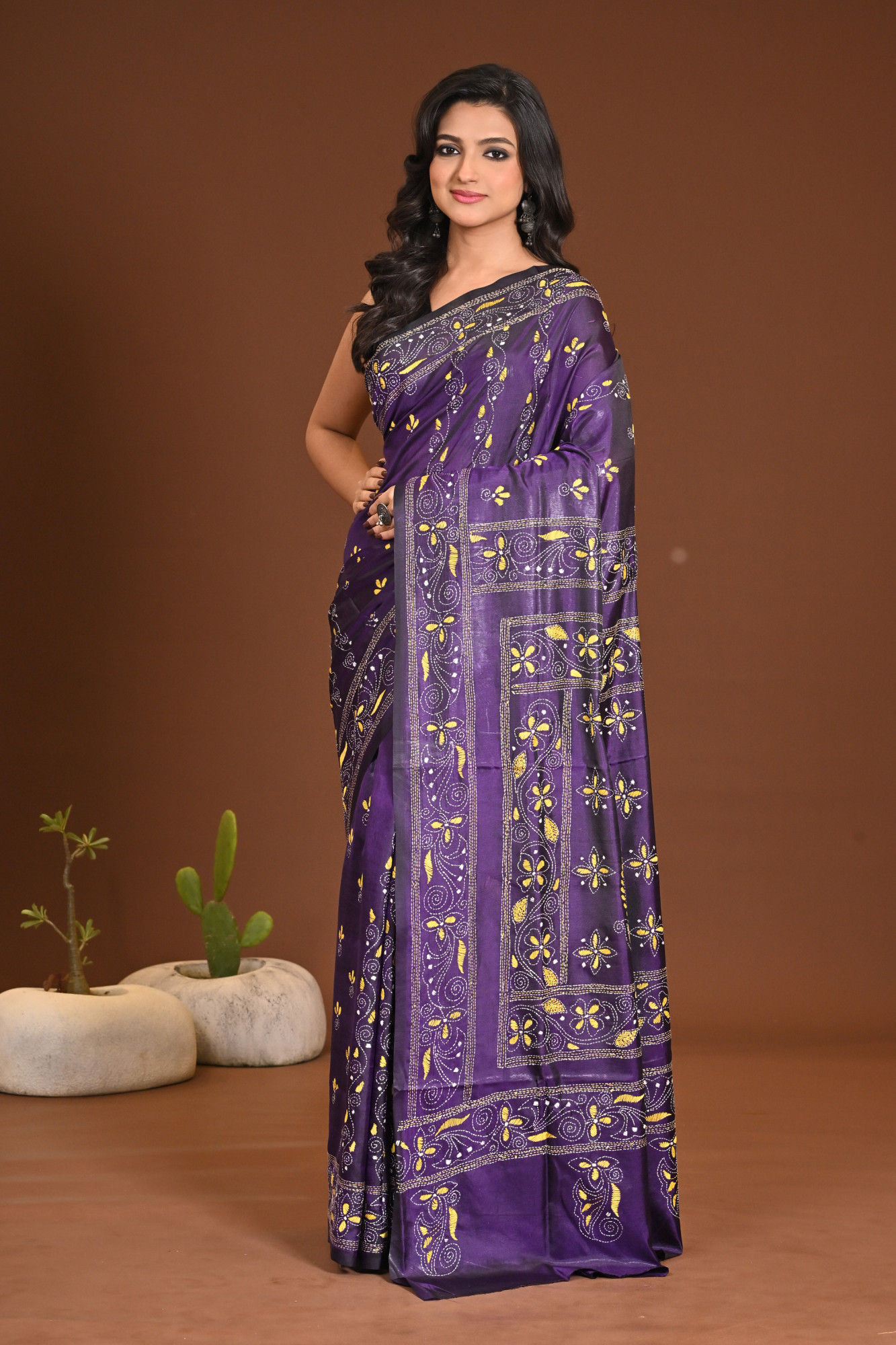 Zari : A blended silk Kantha saree is a traditional Indian saree crafted from a mix of silk and other fibers, adorned with Kantha embroidery—a hand-stitched technique originating from Bengal. These sarees are known for their lightweight drape, smooth texture, and intricate, often storytelling motifs stitched in fine running stitches. The blend of silk gives it a soft sheen and elegance, making it a perfect choice for both festive and casual occasions.