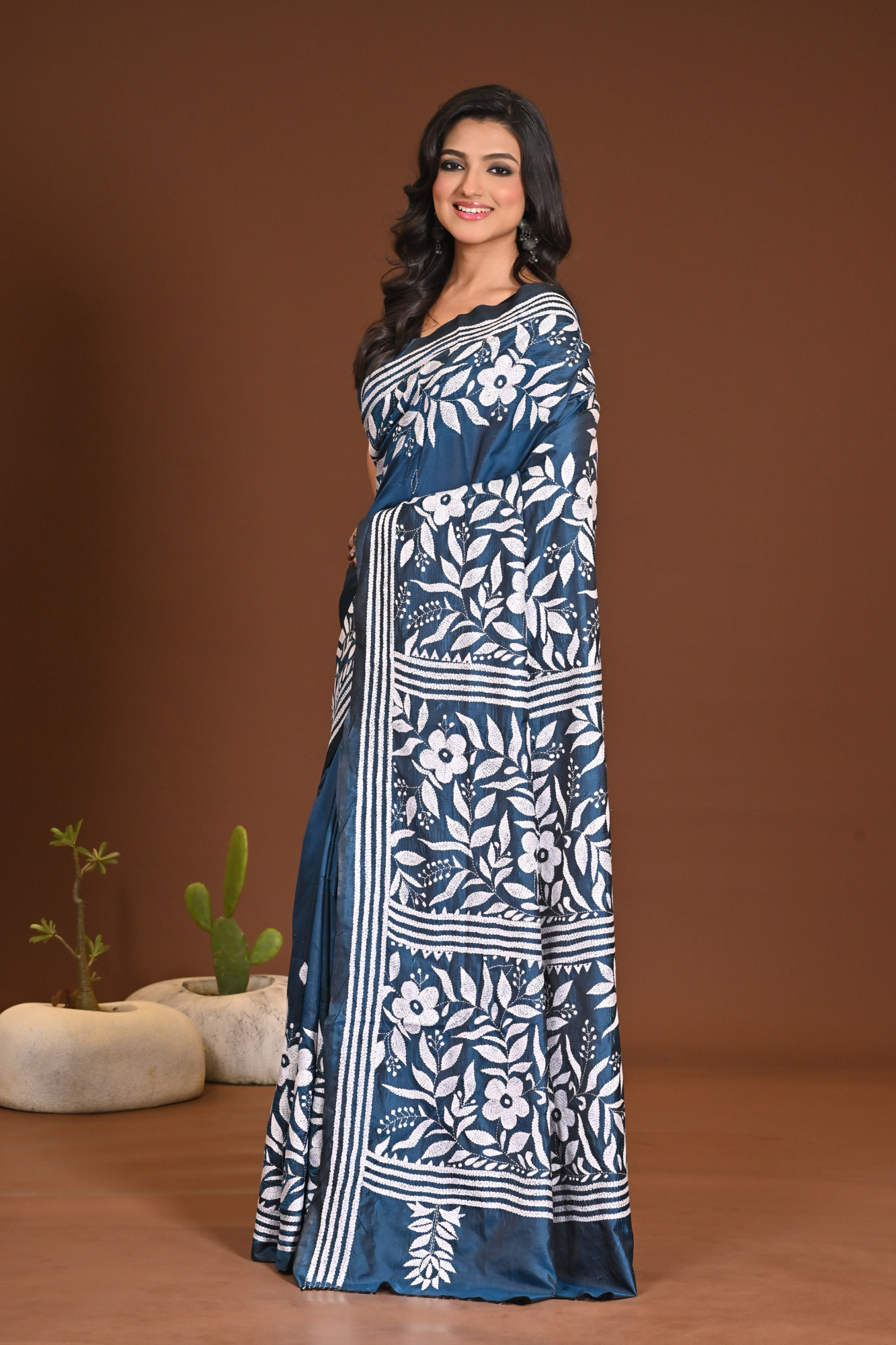 Zari : A blended silk Kantha saree is a traditional Indian saree crafted from a mix of silk and other fibers, adorned with Kantha embroidery—a hand-stitched technique originating from Bengal. These sarees are known for their lightweight drape, smooth texture, and intricate, often storytelling motifs stitched in fine running stitches. The blend of silk gives it a soft sheen and elegance, making it a perfect choice for both festive and casual occasions.