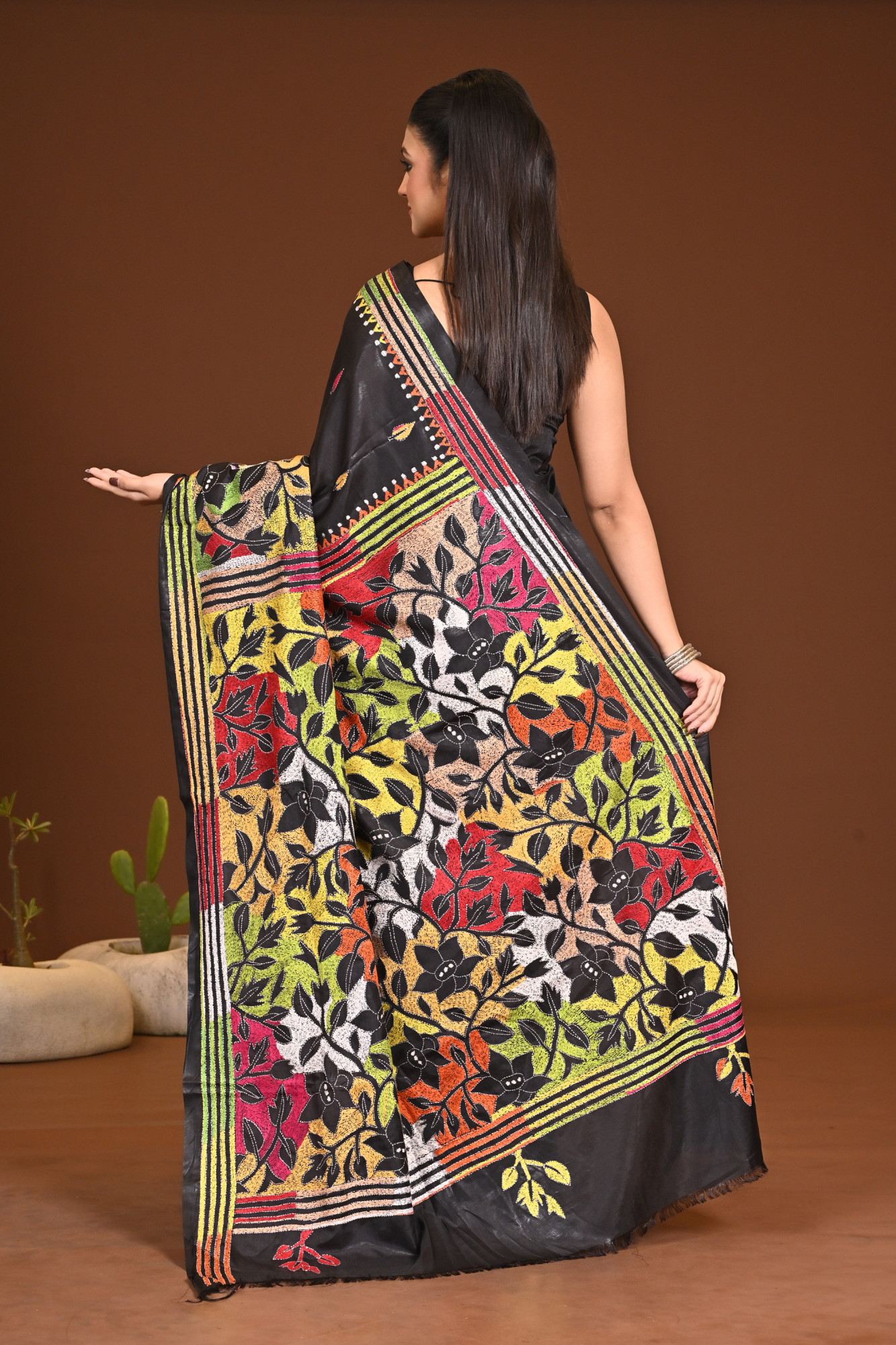 Zari : A blended silk Kantha saree is a traditional Indian saree crafted from a mix of silk and other fibers, adorned with Kantha embroidery—a hand-stitched technique originating from Bengal. These sarees are known for their lightweight drape, smooth texture, and intricate, often storytelling motifs stitched in fine running stitches. The blend of silk gives it a soft sheen and elegance, making it a perfect choice for both festive and casual occasions.
