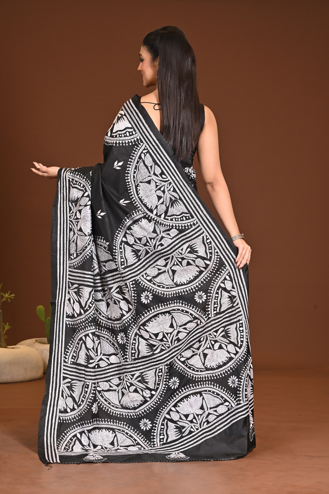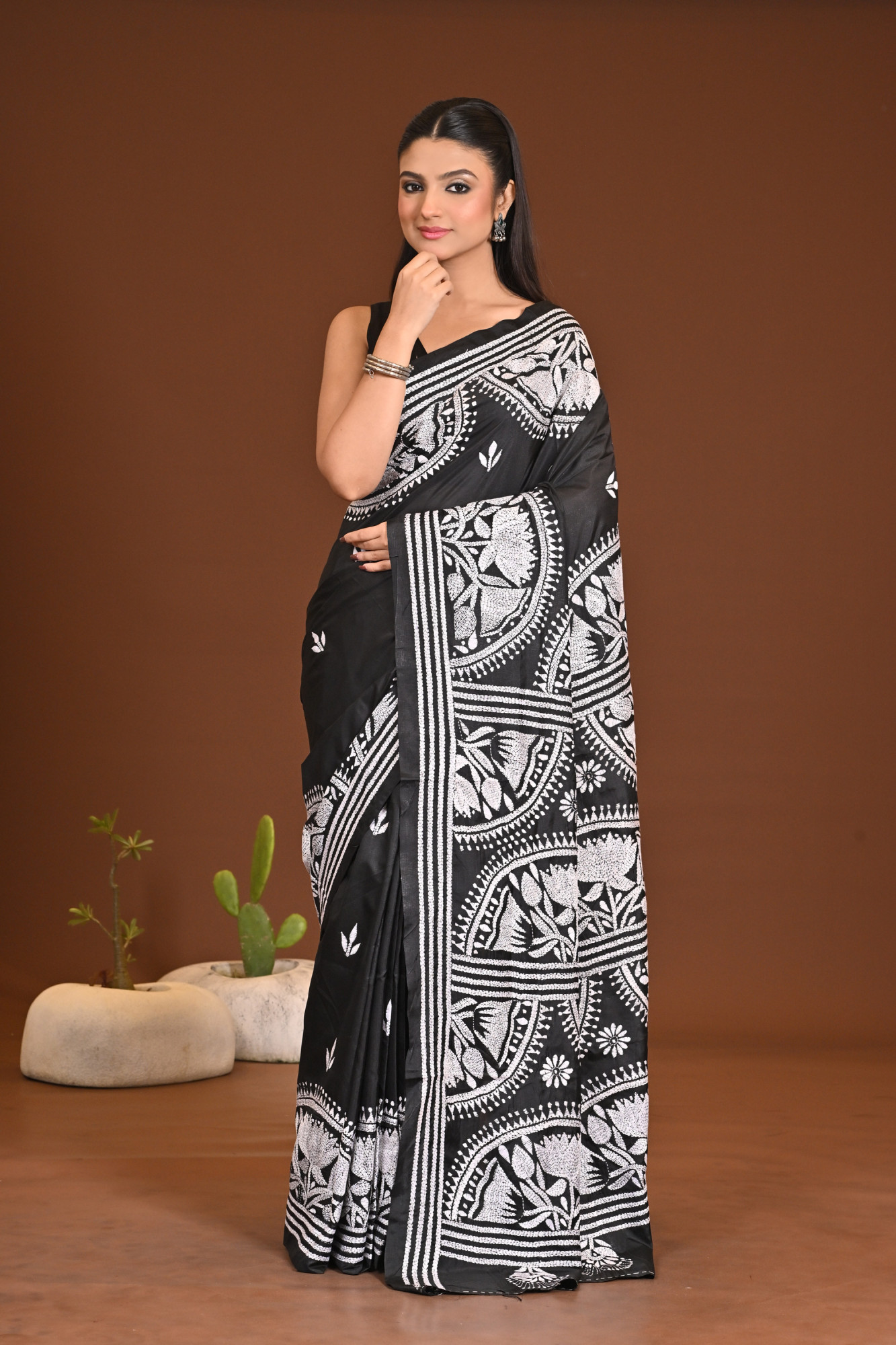 Zari : A blended silk Kantha saree is a traditional Indian saree crafted from a mix of silk and other fibers, adorned with Kantha embroidery—a hand-stitched technique originating from Bengal. These sarees are known for their lightweight drape, smooth texture, and intricate, often storytelling motifs stitched in fine running stitches. The blend of silk gives it a soft sheen and elegance, making it a perfect choice for both festive and casual occasions.