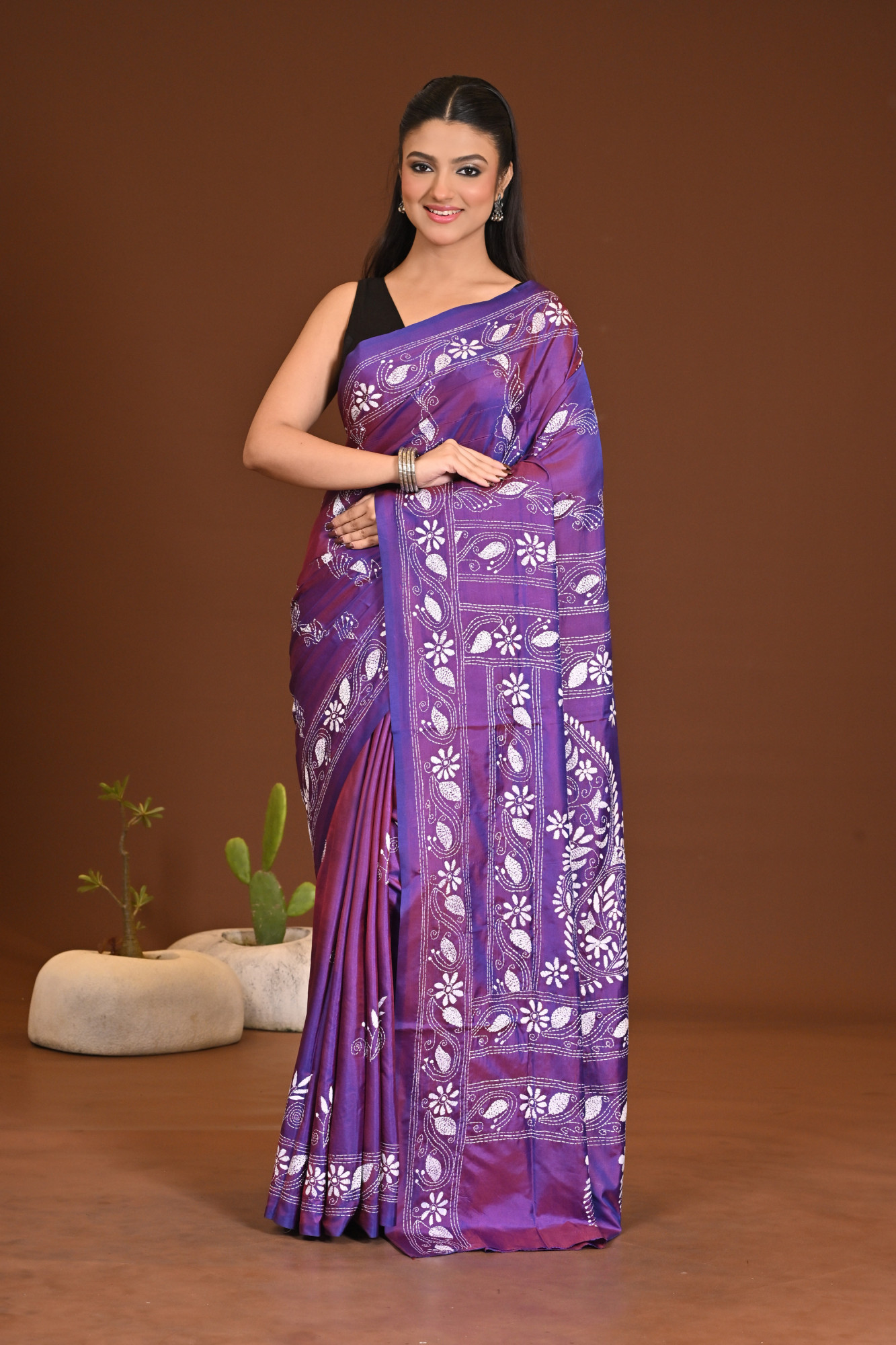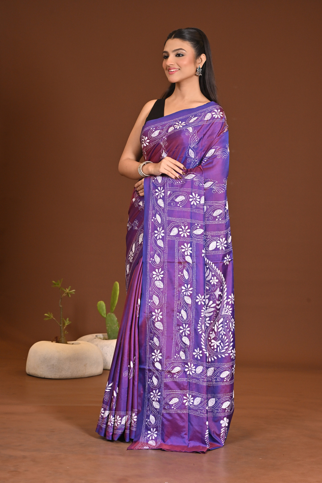 Zari : A blended silk Kantha saree is a traditional Indian saree crafted from a mix of silk and other fibers, adorned with Kantha embroidery—a hand-stitched technique originating from Bengal. These sarees are known for their lightweight drape, smooth texture, and intricate, often storytelling motifs stitched in fine running stitches. The blend of silk gives it a soft sheen and elegance, making it a perfect choice for both festive and casual occasions.