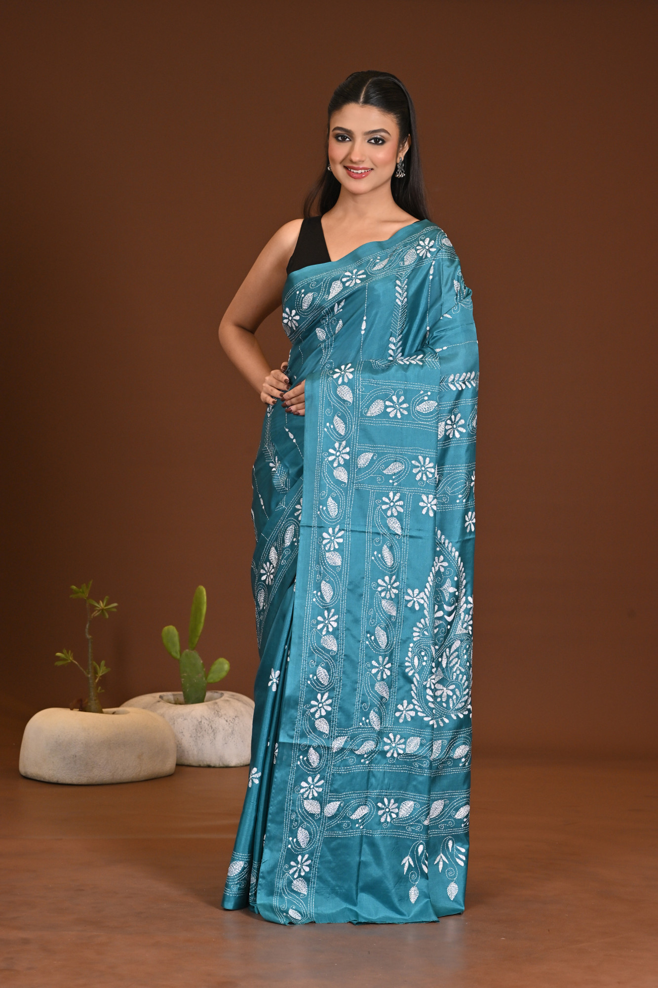 Zari : A blended silk Kantha saree is a traditional Indian saree crafted from a mix of silk and other fibers, adorned with Kantha embroidery—a hand-stitched technique originating from Bengal. These sarees are known for their lightweight drape, smooth texture, and intricate, often storytelling motifs stitched in fine running stitches. The blend of silk gives it a soft sheen and elegance, making it a perfect choice for both festive and casual occasions.