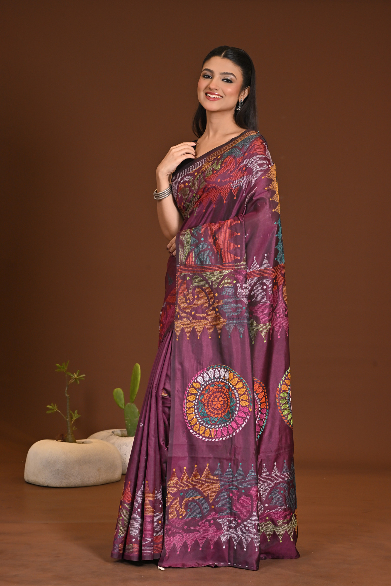 Zari : A blended silk Kantha saree is a traditional Indian saree crafted from a mix of silk and other fibers, adorned with Kantha embroidery—a hand-stitched technique originating from Bengal. These sarees are known for their lightweight drape, smooth texture, and intricate, often storytelling motifs stitched in fine running stitches. The blend of silk gives it a soft sheen and elegance, making it a perfect choice for both festive and casual occasions.