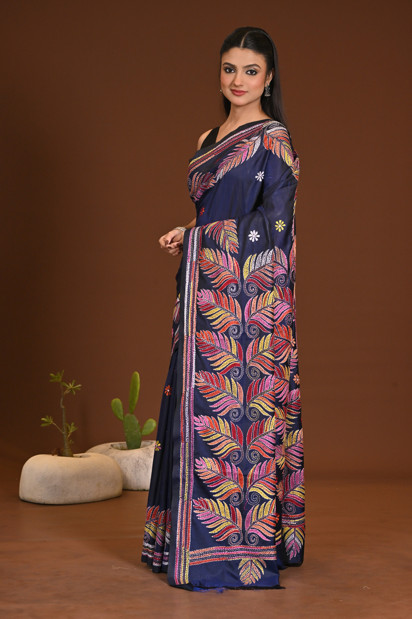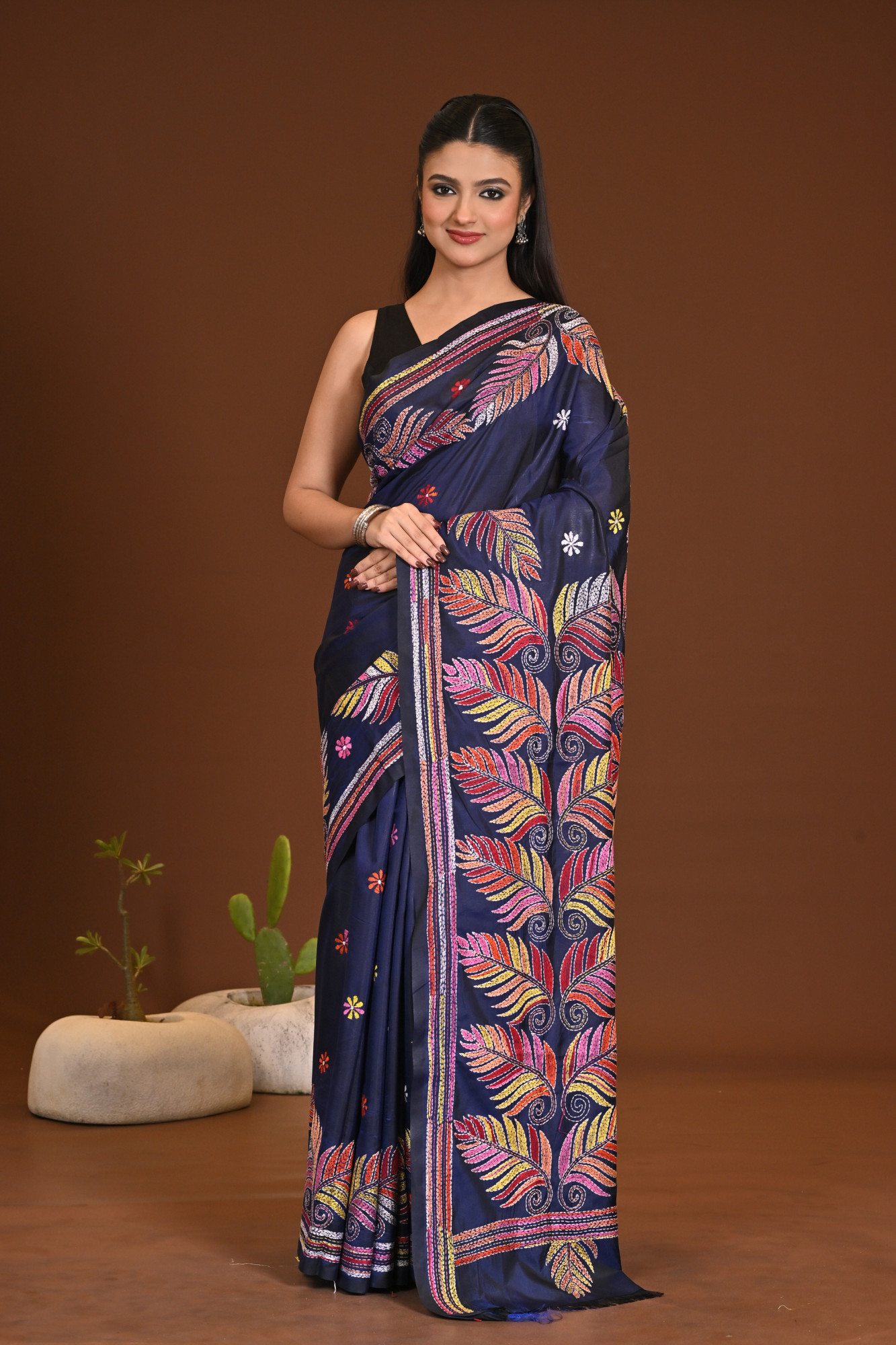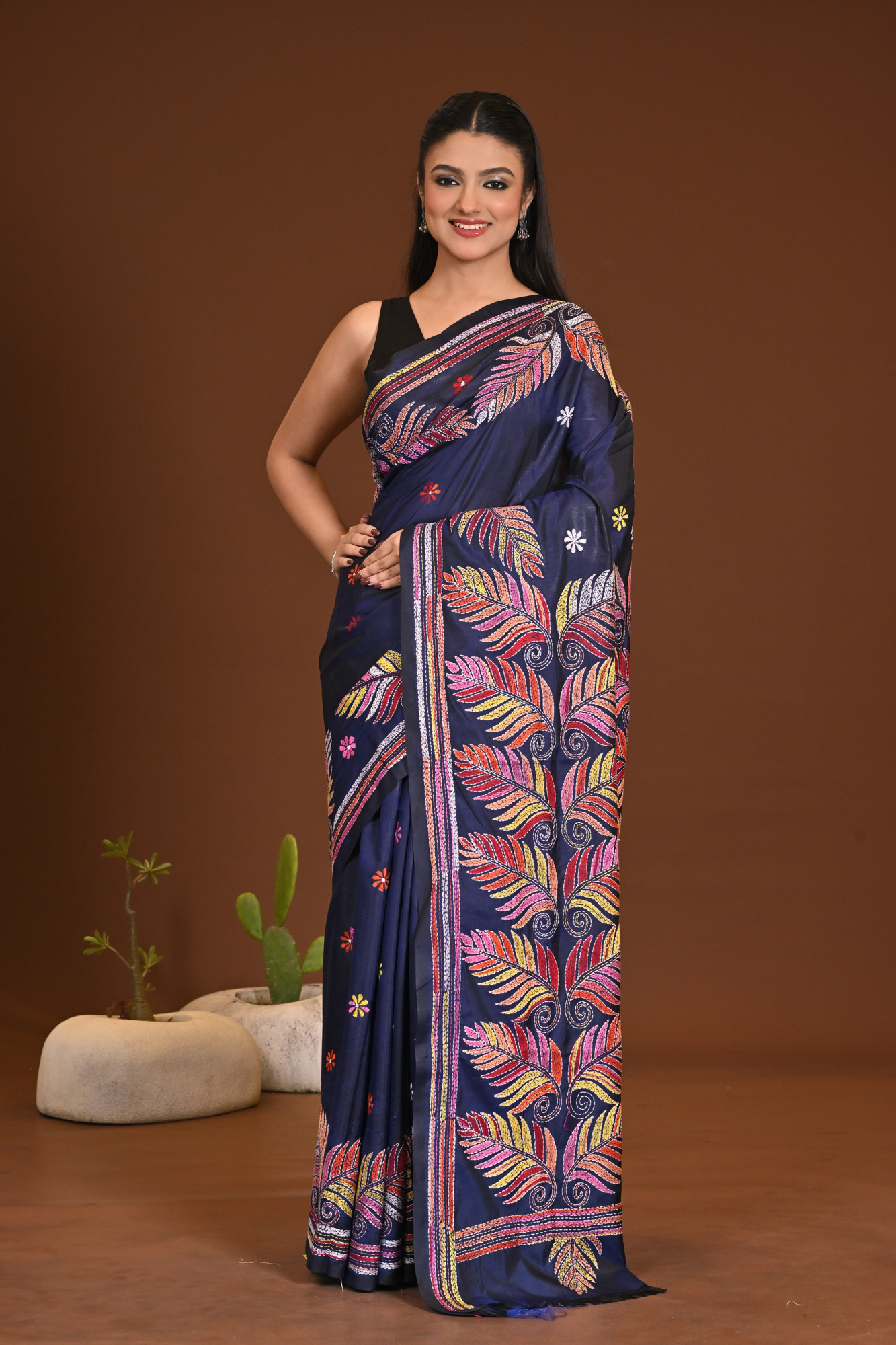 Zari : A blended silk Kantha saree is a traditional Indian saree crafted from a mix of silk and other fibers, adorned with Kantha embroidery—a hand-stitched technique originating from Bengal. These sarees are known for their lightweight drape, smooth texture, and intricate, often storytelling motifs stitched in fine running stitches. The blend of silk gives it a soft sheen and elegance, making it a perfect choice for both festive and casual occasions.