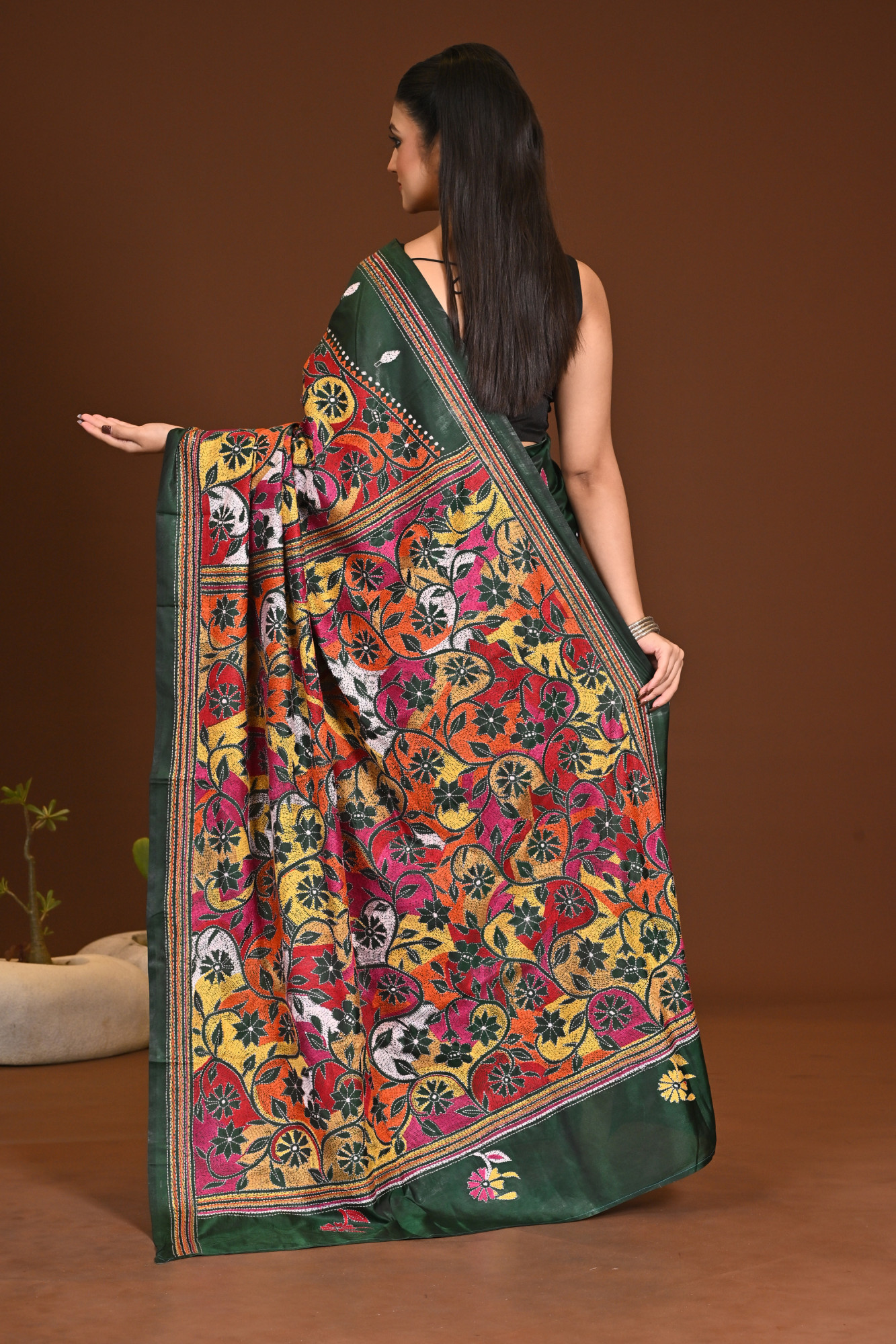 Zari : A blended silk Kantha saree is a traditional Indian saree crafted from a mix of silk and other fibers, adorned with Kantha embroidery—a hand-stitched technique originating from Bengal. These sarees are known for their lightweight drape, smooth texture, and intricate, often storytelling motifs stitched in fine running stitches. The blend of silk gives it a soft sheen and elegance, making it a perfect choice for both festive and casual occasions.