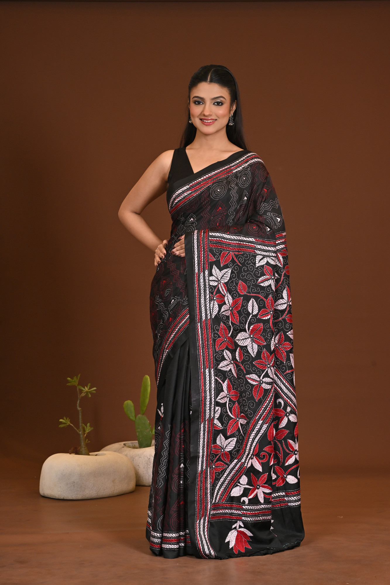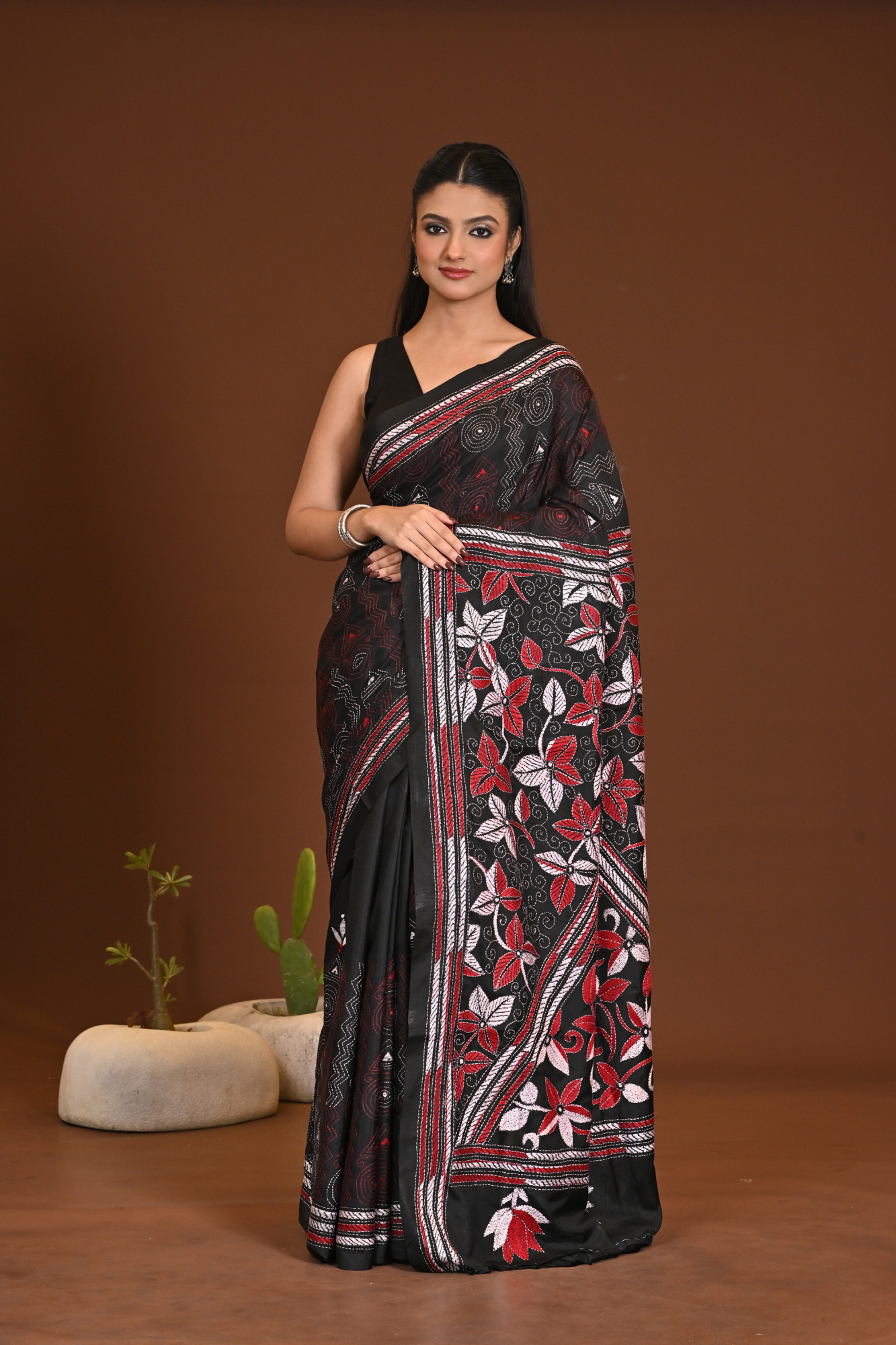 Zari : A blended silk Kantha saree is a traditional Indian saree crafted from a mix of silk and other fibers, adorned with Kantha embroidery—a hand-stitched technique originating from Bengal. These sarees are known for their lightweight drape, smooth texture, and intricate, often storytelling motifs stitched in fine running stitches. The blend of silk gives it a soft sheen and elegance, making it a perfect choice for both festive and casual occasions.