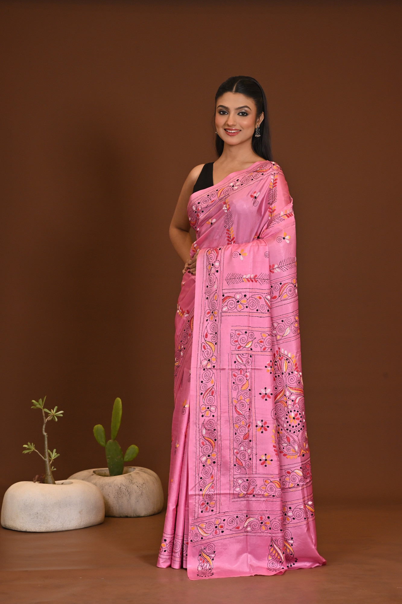 Zari : A blended silk Kantha saree is a traditional Indian saree crafted from a mix of silk and other fibers, adorned with Kantha embroidery—a hand-stitched technique originating from Bengal. These sarees are known for their lightweight drape, smooth texture, and intricate, often storytelling motifs stitched in fine running stitches. The blend of silk gives it a soft sheen and elegance, making it a perfect choice for both festive and casual occasions.