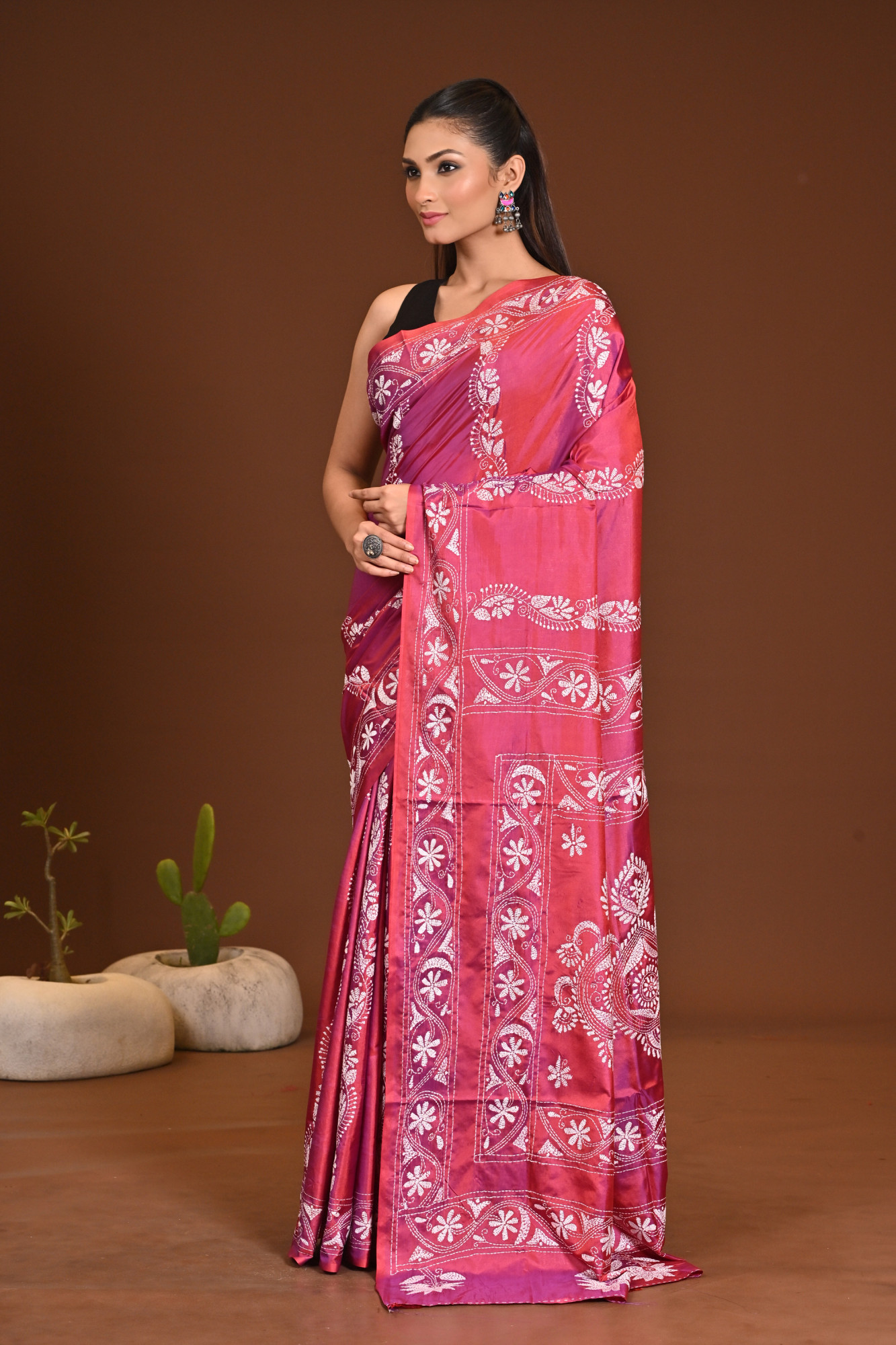 Zari : A blended silk Kantha saree is a traditional Indian saree crafted from a mix of silk and other fibers, adorned with Kantha embroidery—a hand-stitched technique originating from Bengal. These sarees are known for their lightweight drape, smooth texture, and intricate, often storytelling motifs stitched in fine running stitches. The blend of silk gives it a soft sheen and elegance, making it a perfect choice for both festive and casual occasions.