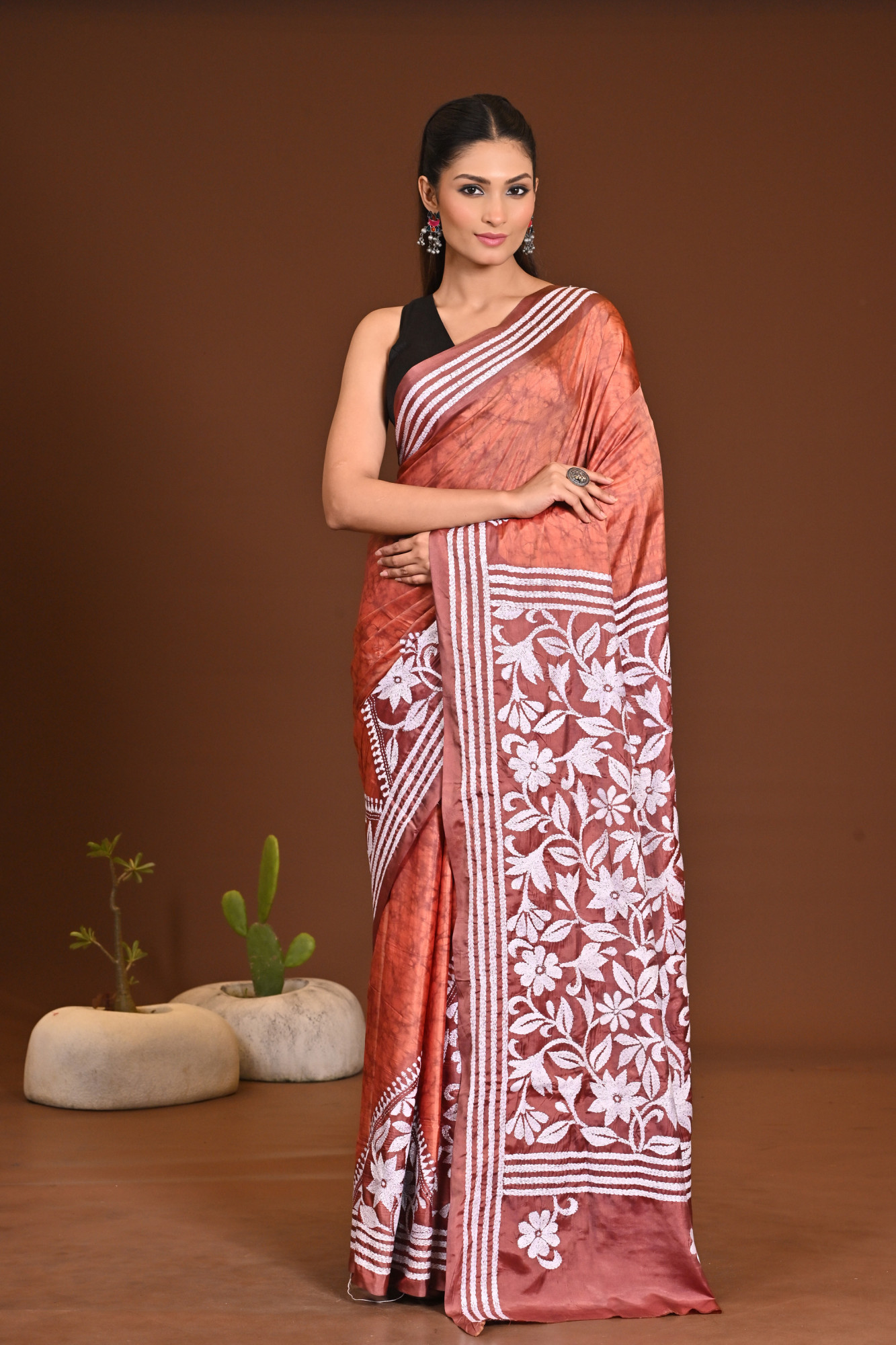 Zari : A blended silk Kantha saree is a traditional Indian saree crafted from a mix of silk and other fibers, adorned with Kantha embroidery—a hand-stitched technique originating from Bengal. These sarees are known for their lightweight drape, smooth texture, and intricate, often storytelling motifs stitched in fine running stitches. The blend of silk gives it a soft sheen and elegance, making it a perfect choice for both festive and casual occasions.