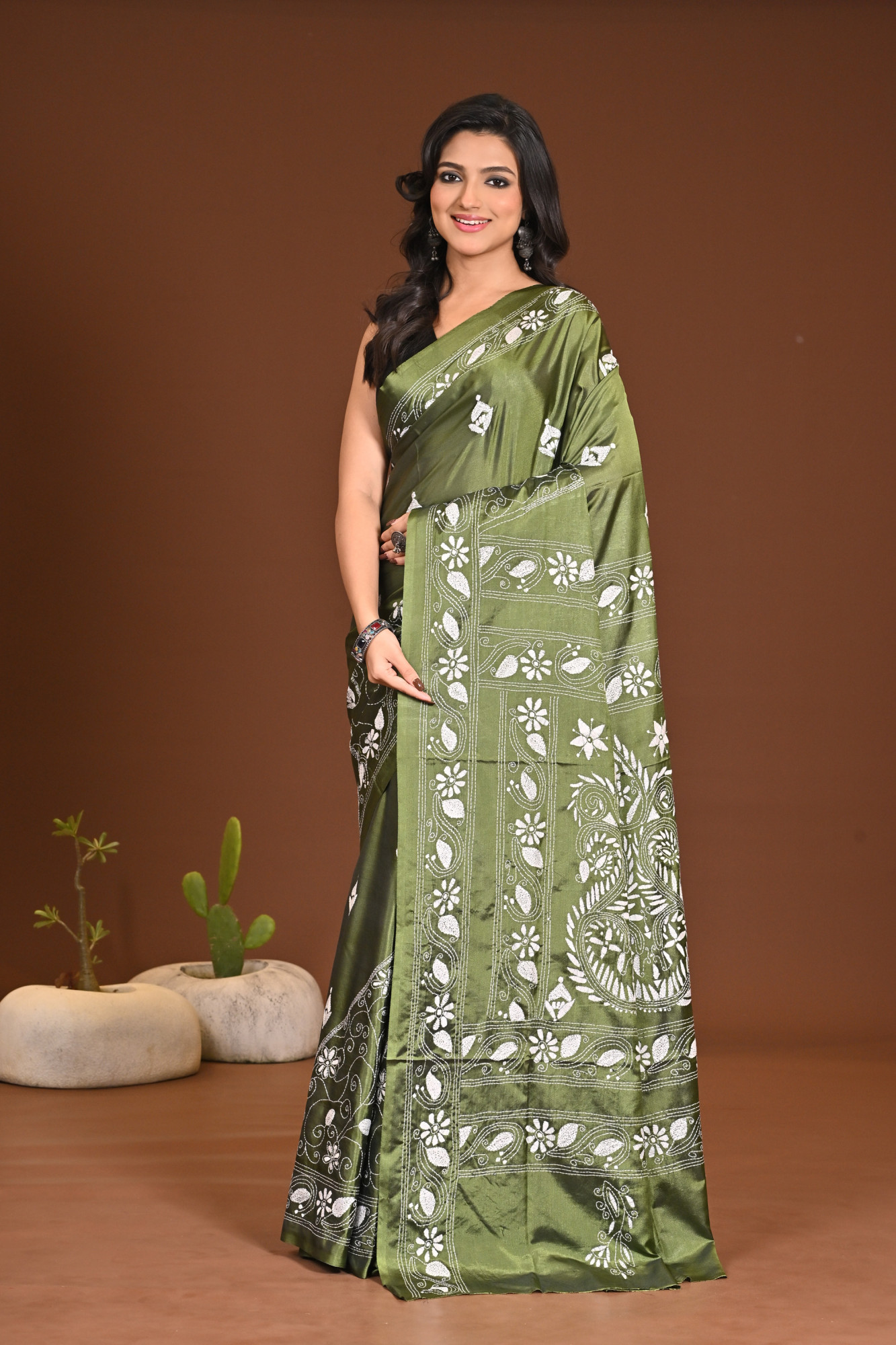 Zari : A blended silk Kantha saree is a traditional Indian saree crafted from a mix of silk and other fibers, adorned with Kantha embroidery—a hand-stitched technique originating from Bengal. These sarees are known for their lightweight drape, smooth texture, and intricate, often storytelling motifs stitched in fine running stitches. The blend of silk gives it a soft sheen and elegance, making it a perfect choice for both festive and casual occasions.