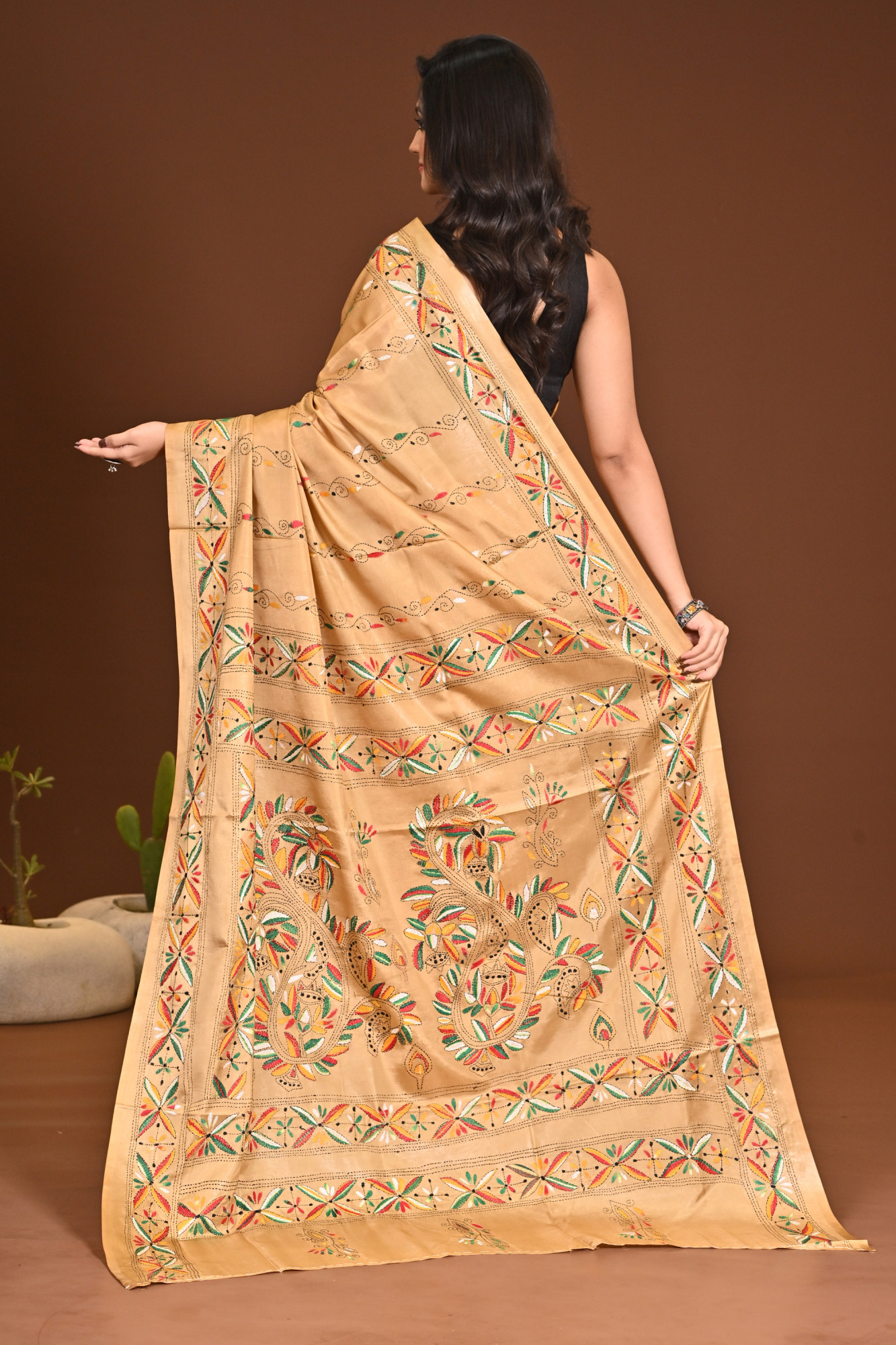 Zari : A blended silk Kantha saree is a traditional Indian saree crafted from a mix of silk and other fibers, adorned with Kantha embroidery—a hand-stitched technique originating from Bengal. These sarees are known for their lightweight drape, smooth texture, and intricate, often storytelling motifs stitched in fine running stitches. The blend of silk gives it a soft sheen and elegance, making it a perfect choice for both festive and casual occasions.