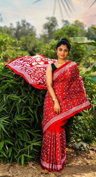 Zari : A blended silk Kantha saree is a traditional Indian saree crafted from a mix of silk and other fibers, adorned with Kantha embroidery—a hand-stitched technique originating from Bengal. These sarees are known for their lightweight drape, smooth texture, and intricate, often storytelling motifs stitched in fine running stitches. The blend of silk gives it a soft sheen and elegance, making it a perfect choice for both festive and casual occasions.