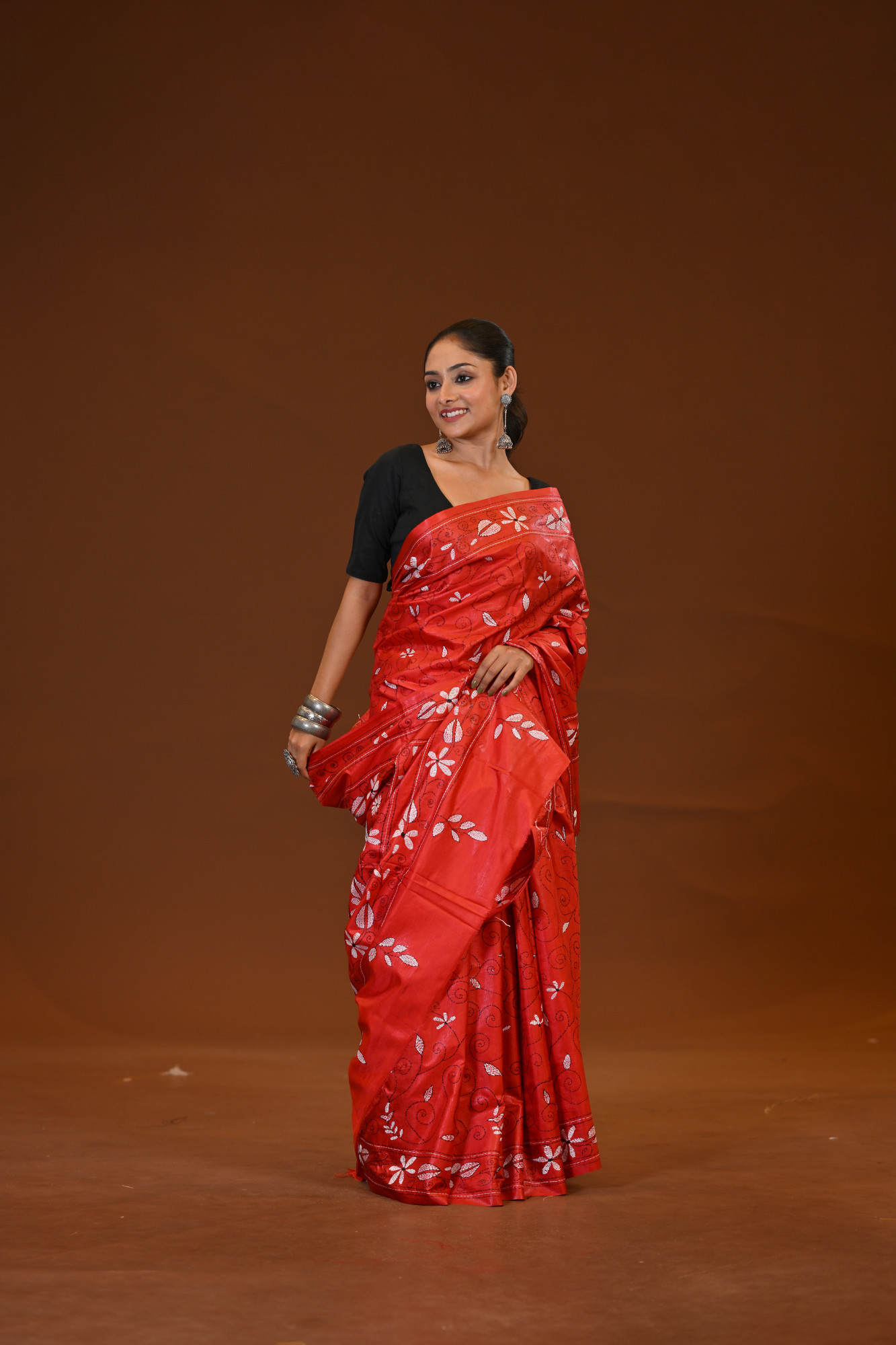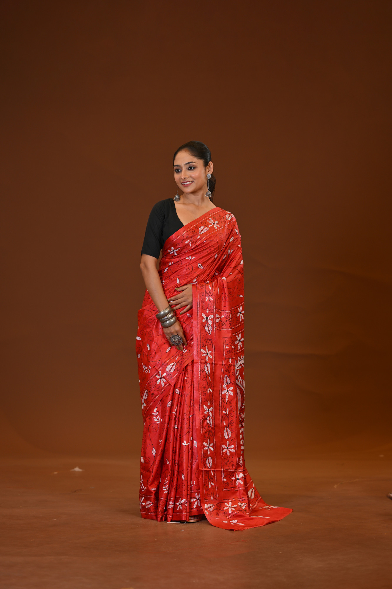 Zari : A blended silk Kantha saree is a traditional Indian saree crafted from a mix of silk and other fibers, adorned with Kantha embroidery—a hand-stitched technique originating from Bengal. These sarees are known for their lightweight drape, smooth texture, and intricate, often storytelling motifs stitched in fine running stitches. The blend of silk gives it a soft sheen and elegance, making it a perfect choice for both festive and casual occasions.