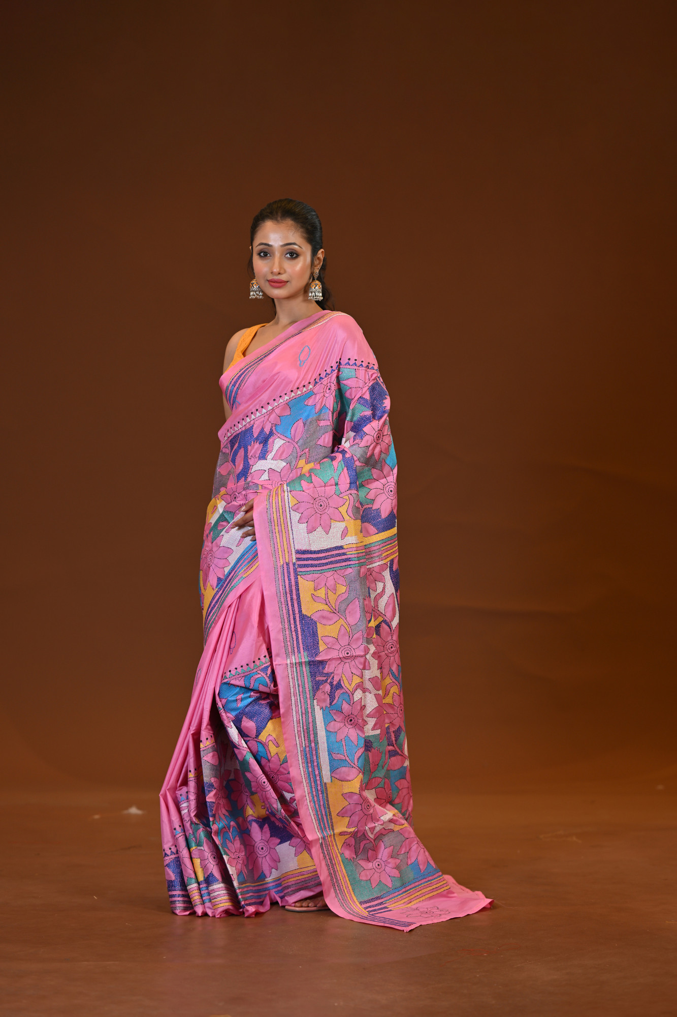 Zari : A blended silk Kantha saree is a traditional Indian saree crafted from a mix of silk and other fibers, adorned with Kantha embroidery—a hand-stitched technique originating from Bengal. These sarees are known for their lightweight drape, smooth texture, and intricate, often storytelling motifs stitched in fine running stitches. The blend of silk gives it a soft sheen and elegance, making it a perfect choice for both festive and casual occasions.
