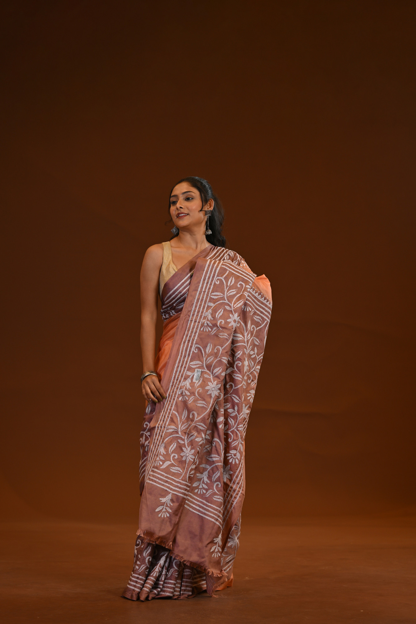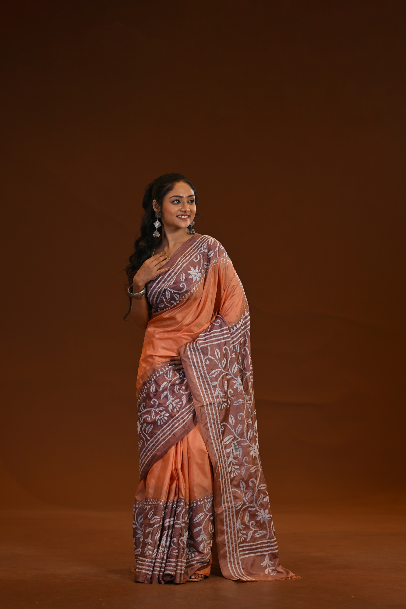 Zari : A blended silk Kantha saree is a traditional Indian saree crafted from a mix of silk and other fibers, adorned with Kantha embroidery—a hand-stitched technique originating from Bengal. These sarees are known for their lightweight drape, smooth texture, and intricate, often storytelling motifs stitched in fine running stitches. The blend of silk gives it a soft sheen and elegance, making it a perfect choice for both festive and casual occasions.