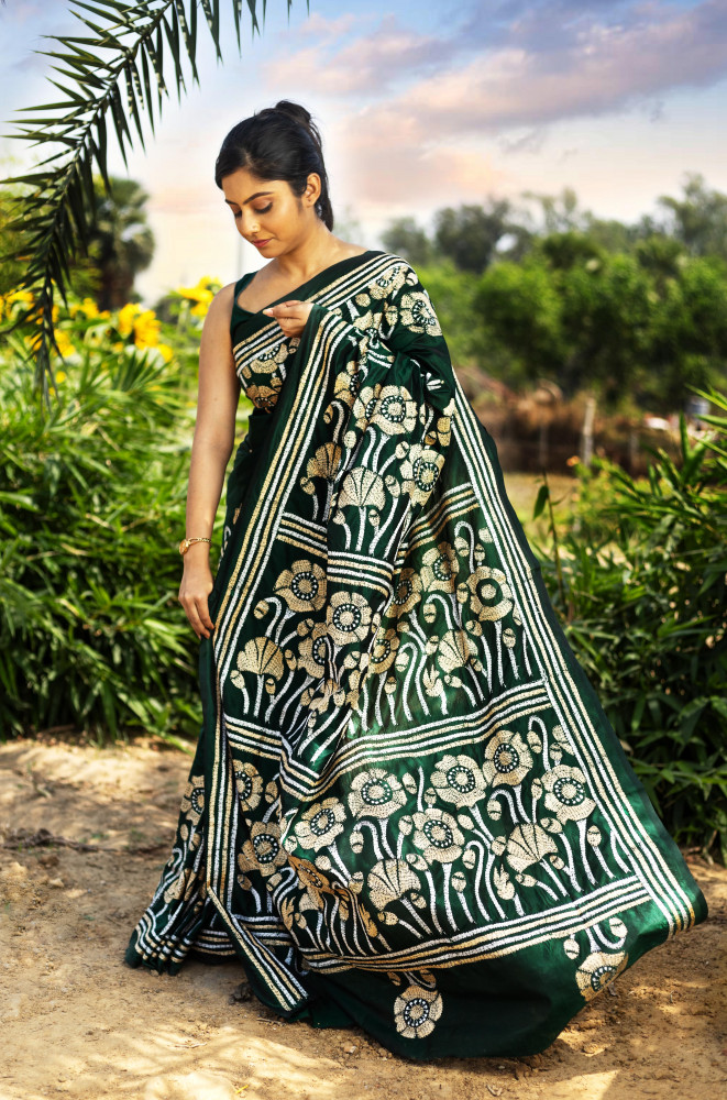 Zari : A blended silk Kantha saree is a traditional Indian saree crafted from a mix of silk and other fibers, adorned with Kantha embroidery—a hand-stitched technique originating from Bengal. These sarees are known for their lightweight drape, smooth texture, and intricate, often storytelling motifs stitched in fine running stitches. The blend of silk gives it a soft sheen and elegance, making it a perfect choice for both festive and casual occasions.