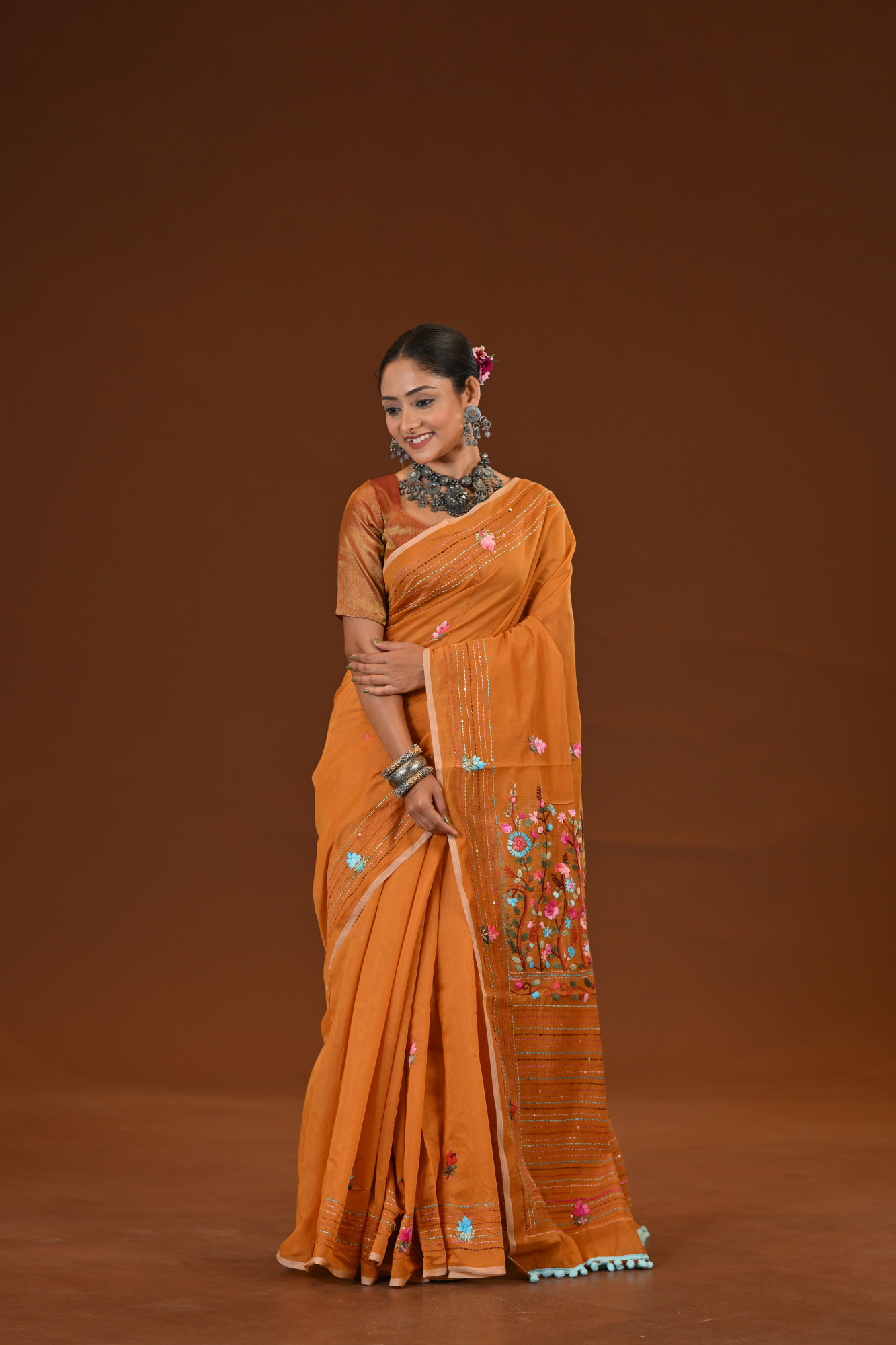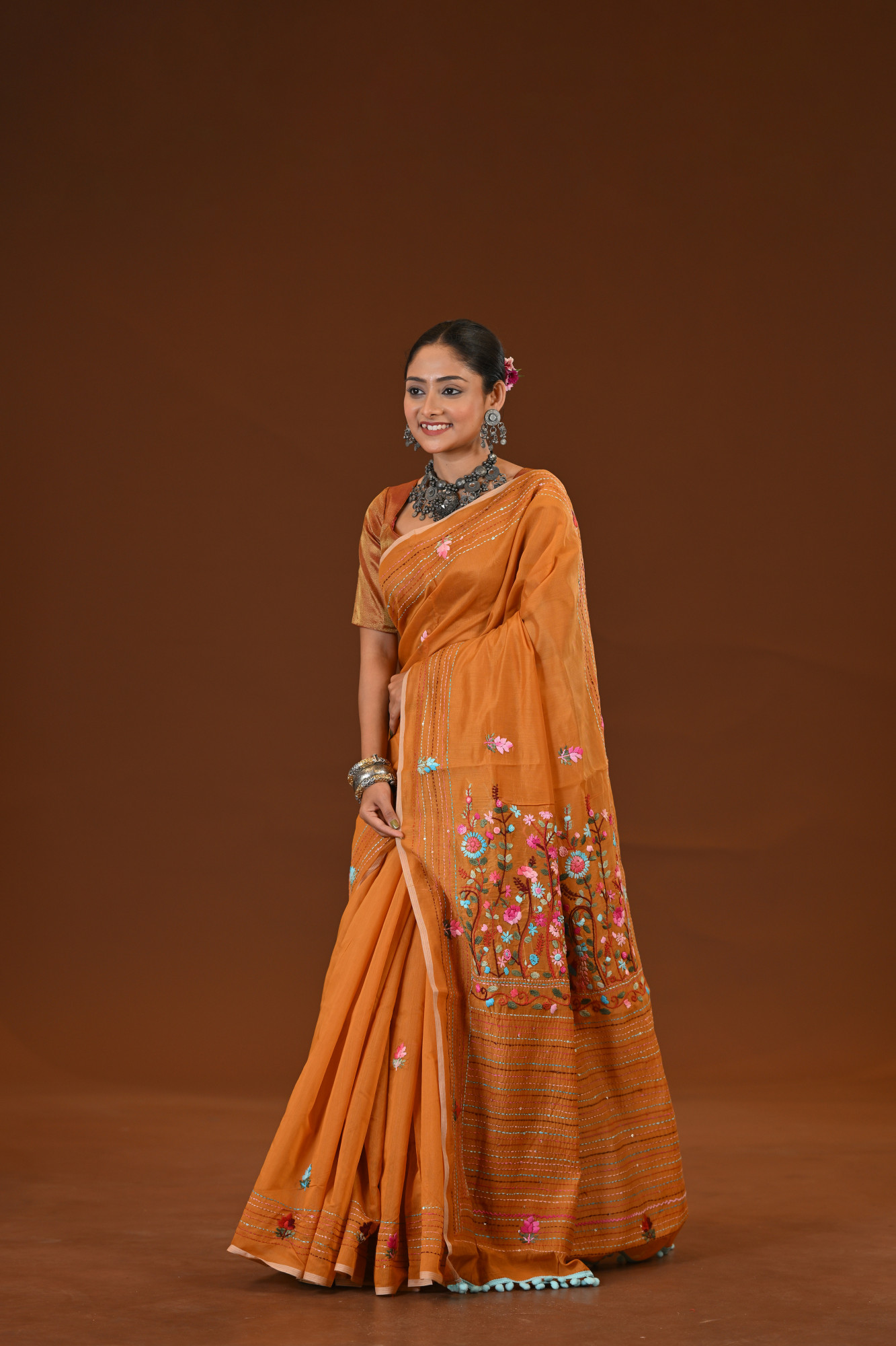 Material : Cotton Silk Zari : Bulian Stitch Kantha Saree is a beautifully handcrafted drape that showcases the timeless artistry of traditional Kantha embroidery. Featuring delicate Bulian (bullion knot–style) stitches, this saree is adorned with intricate floral and textured motifs that add depth, elegance, and a rich handcrafted appeal. Lightweight and graceful, it blends heritage craftsmanship with contemporary charm—perfect for festive occasions, cultural gatherings, and elegant daywear. Inclusion : Comes with a matching blouse piece measuring 100 centimeters. Blouse worn by the model is not included.