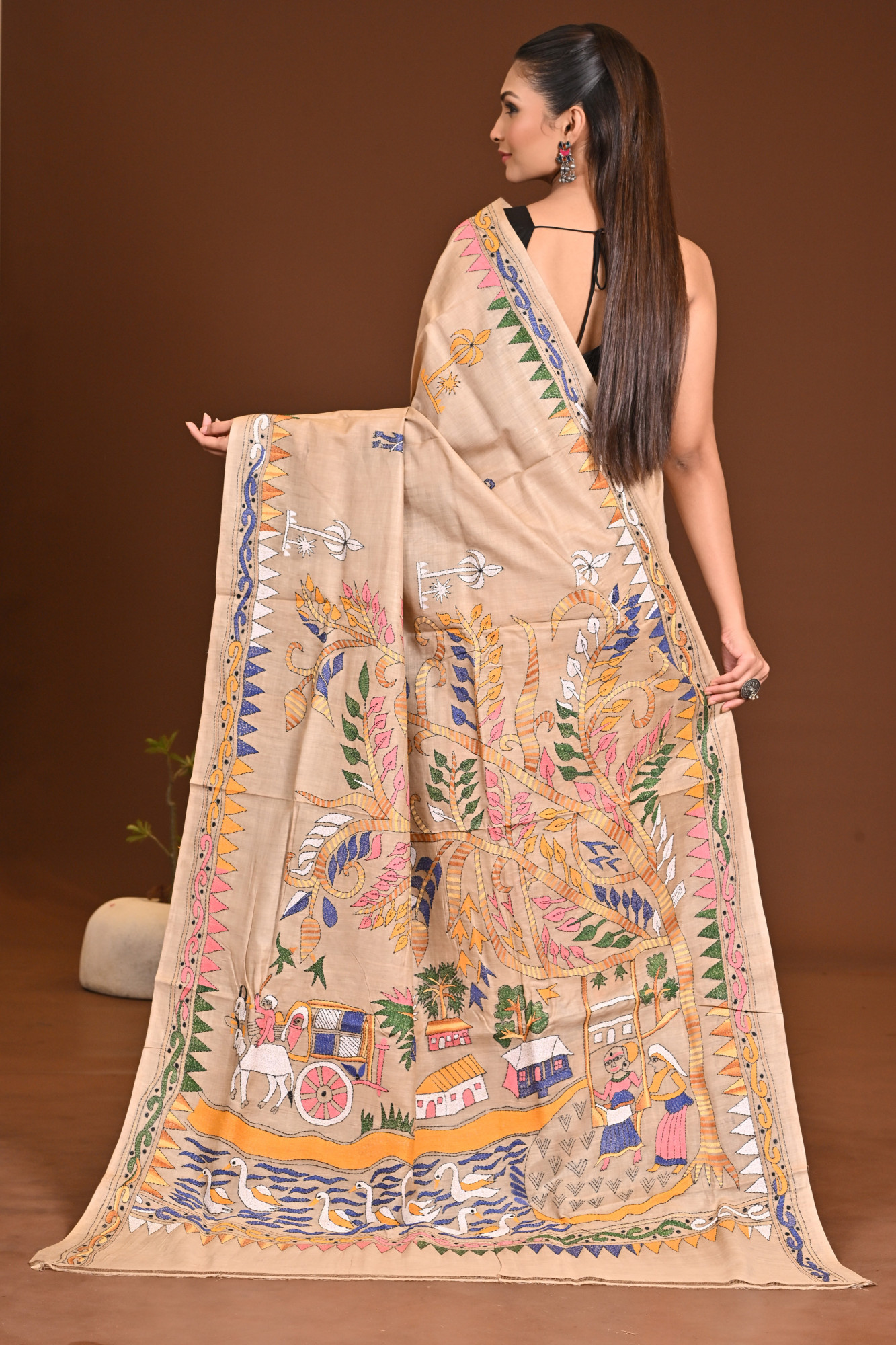 Zari : A Gachi Silk Kantha Saree is a luxurious handwoven saree made from Gachi silk, known for its smooth texture and natural sheen. It features exquisite Kantha embroidery, a traditional Bengali hand-stitching technique that adds intricate patterns and storytelling motifs. Elegant and artisanal, this saree showcases fine craftsmanship, making it ideal for cultural events, festivities, and special occasions.
