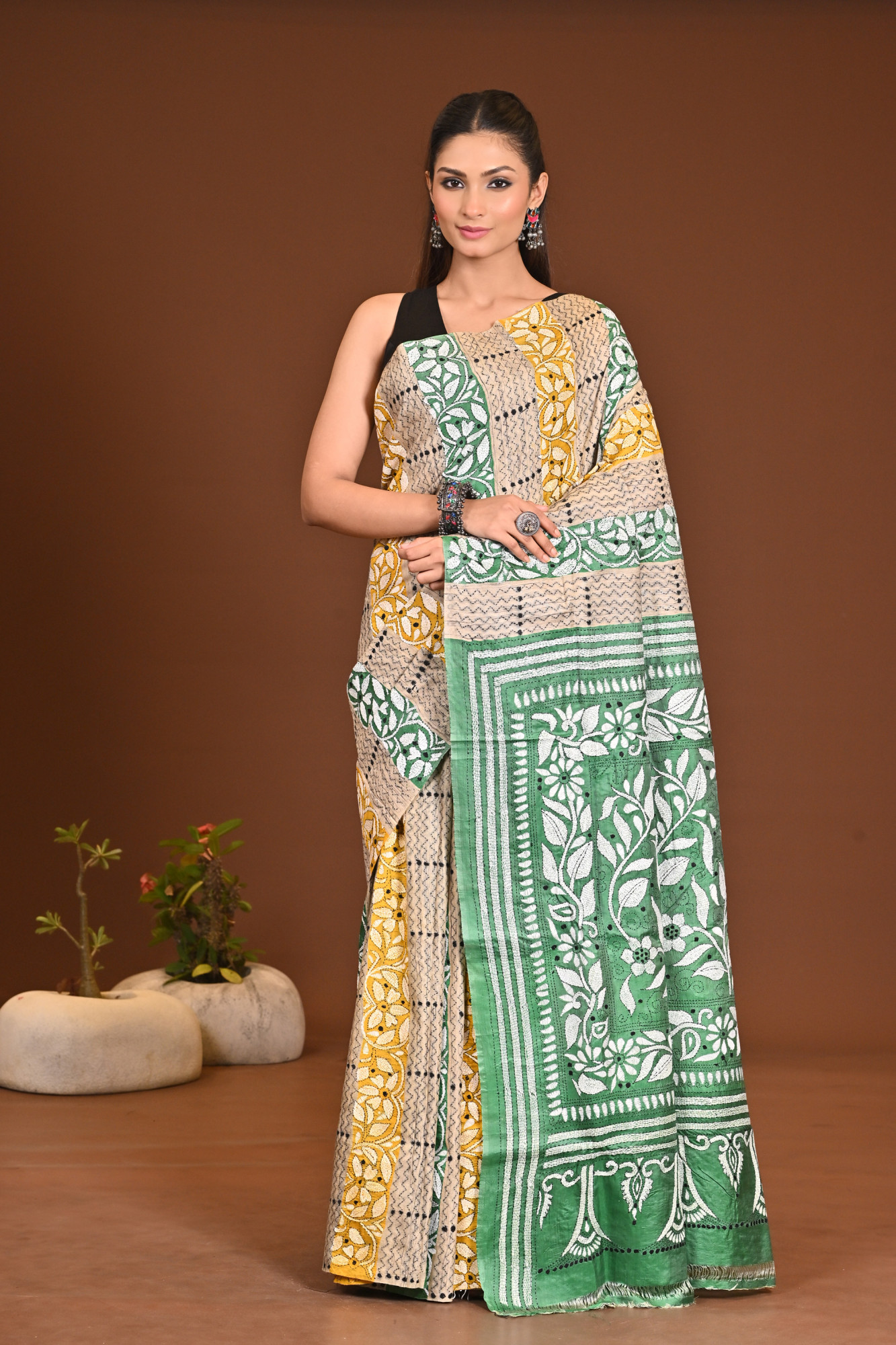 Zari : A Gachi Silk Kantha Saree is a luxurious handwoven saree made from Gachi silk, known for its smooth texture and natural sheen. It features exquisite Kantha embroidery, a traditional Bengali hand-stitching technique that adds intricate patterns and storytelling motifs. Elegant and artisanal, this saree showcases fine craftsmanship, making it ideal for cultural events, festivities, and special occasions.