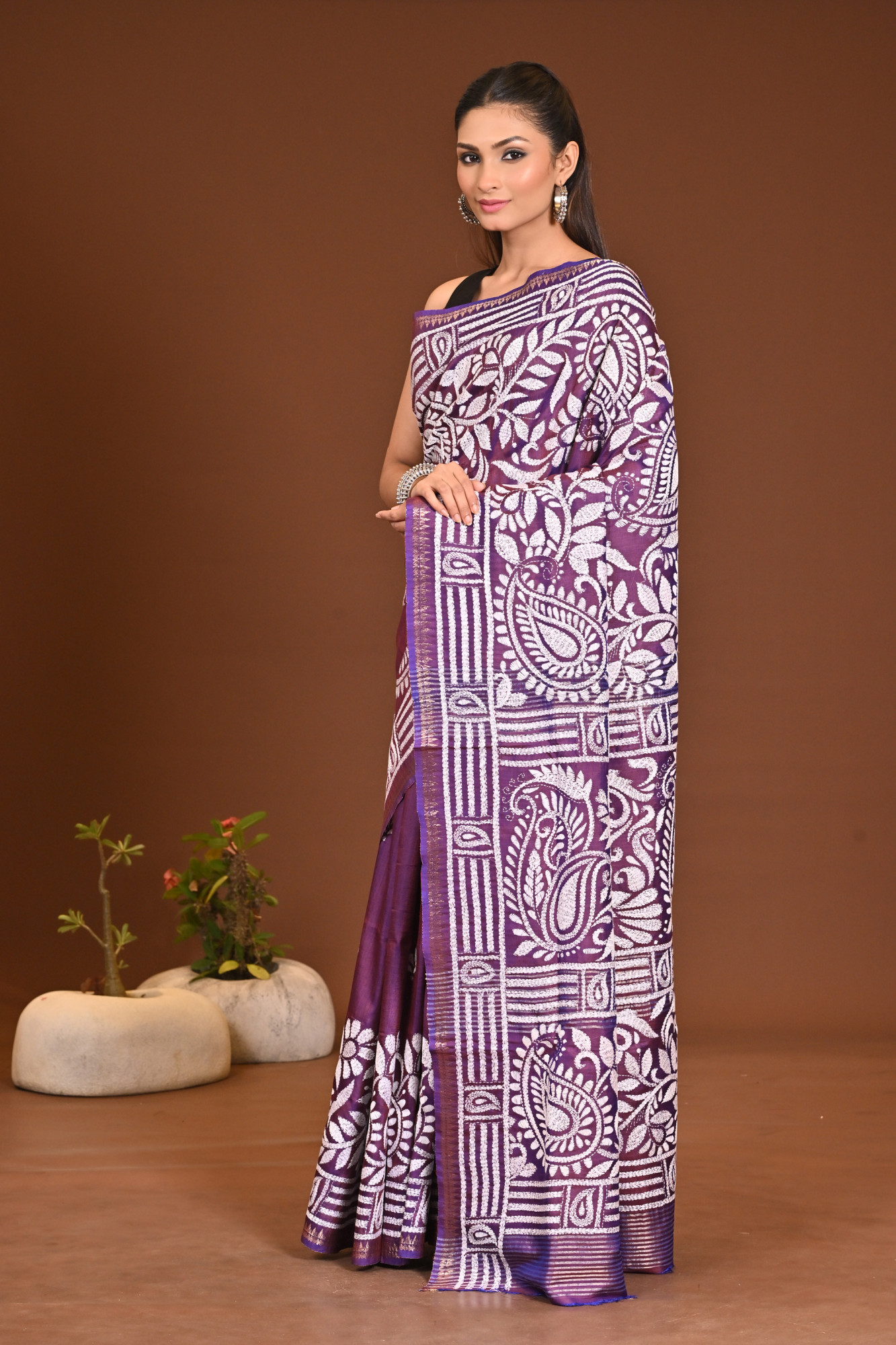 Zari : A Gachi Silk Kantha Saree is a luxurious handwoven saree made from Gachi silk, known for its smooth texture and natural sheen. It features exquisite Kantha embroidery, a traditional Bengali hand-stitching technique that adds intricate patterns and storytelling motifs. Elegant and artisanal, this saree showcases fine craftsmanship, making it ideal for cultural events, festivities, and special occasions.