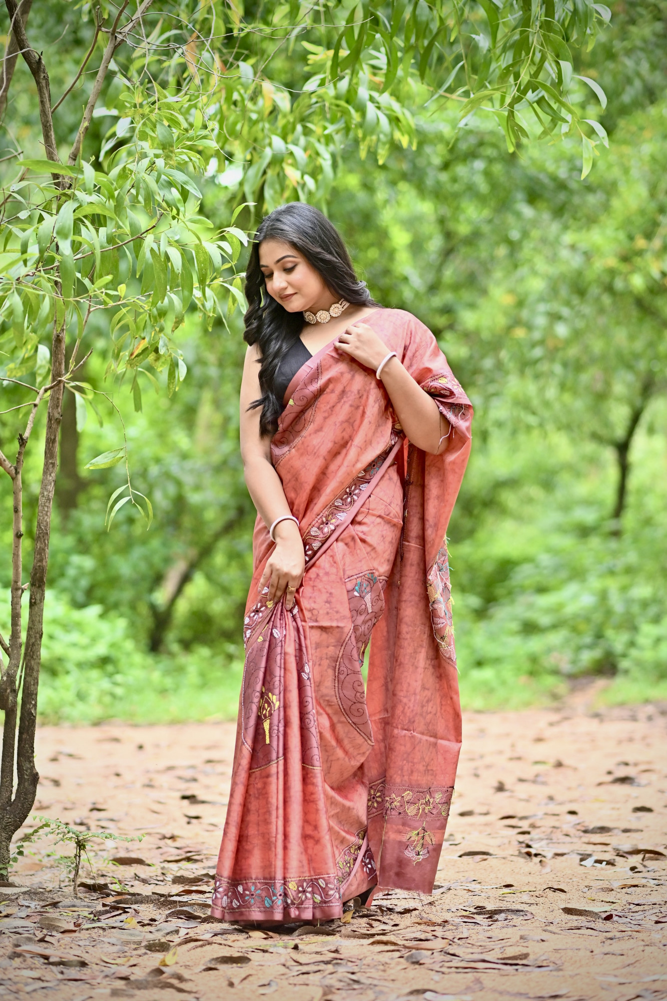 Zari : A blended silk Kantha saree is a traditional Indian saree crafted from a mix of silk and other fibers, adorned with Kantha embroidery—a hand-stitched technique originating from Bengal. These sarees are known for their lightweight drape, smooth texture, and intricate, often storytelling motifs stitched in fine running stitches. The blend of silk gives it a soft sheen and elegance, making it a perfect choice for both festive and casual occasions.