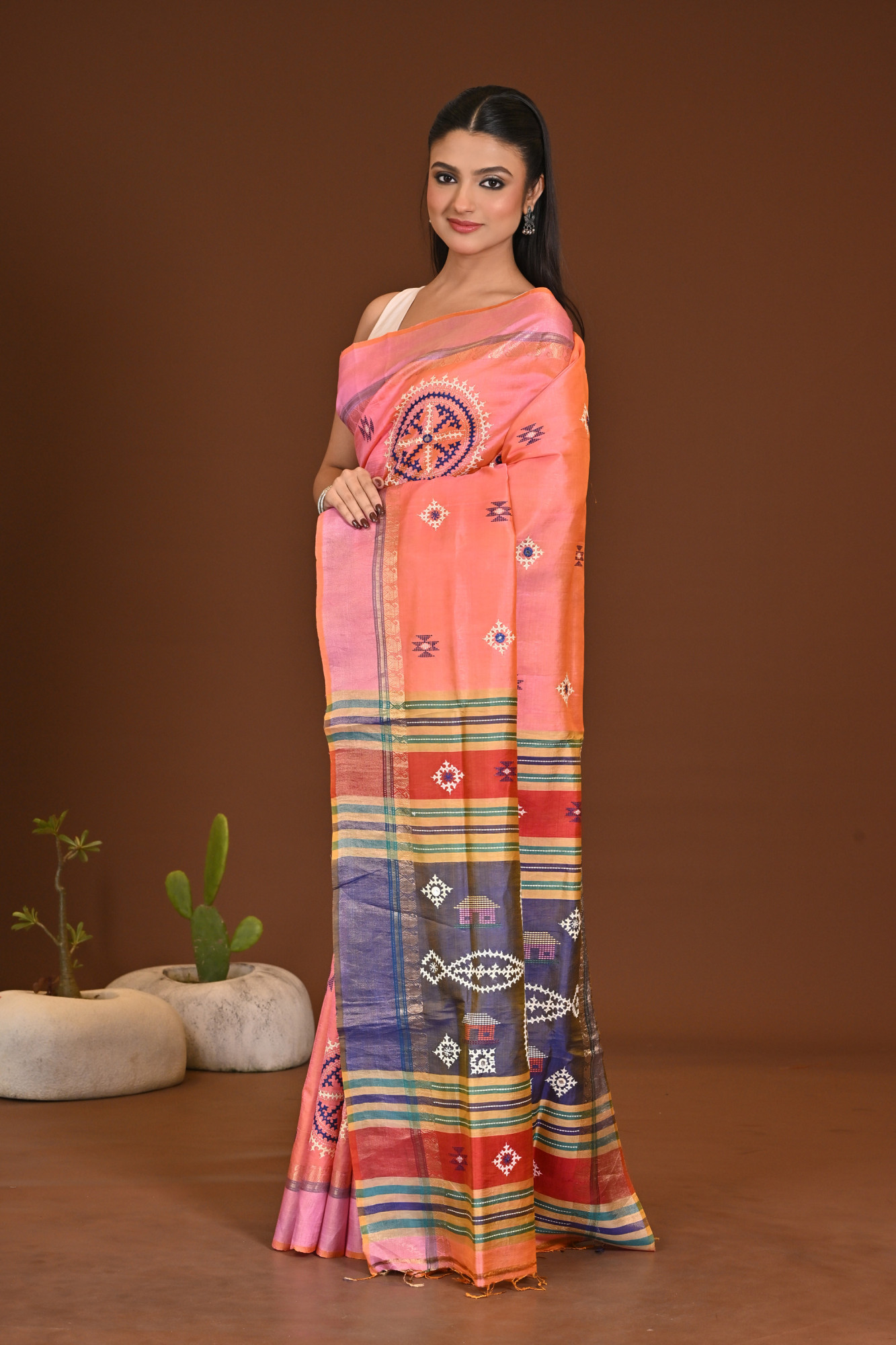 Zari : A Katan Kalakhatra Saree features luxurious katan silk adorned with bold, artistic kalakhatra-style patterns. Its smooth sheen, rich texture, and striking traditional motifs create a graceful, premium drape perfect for festive and special occasions.