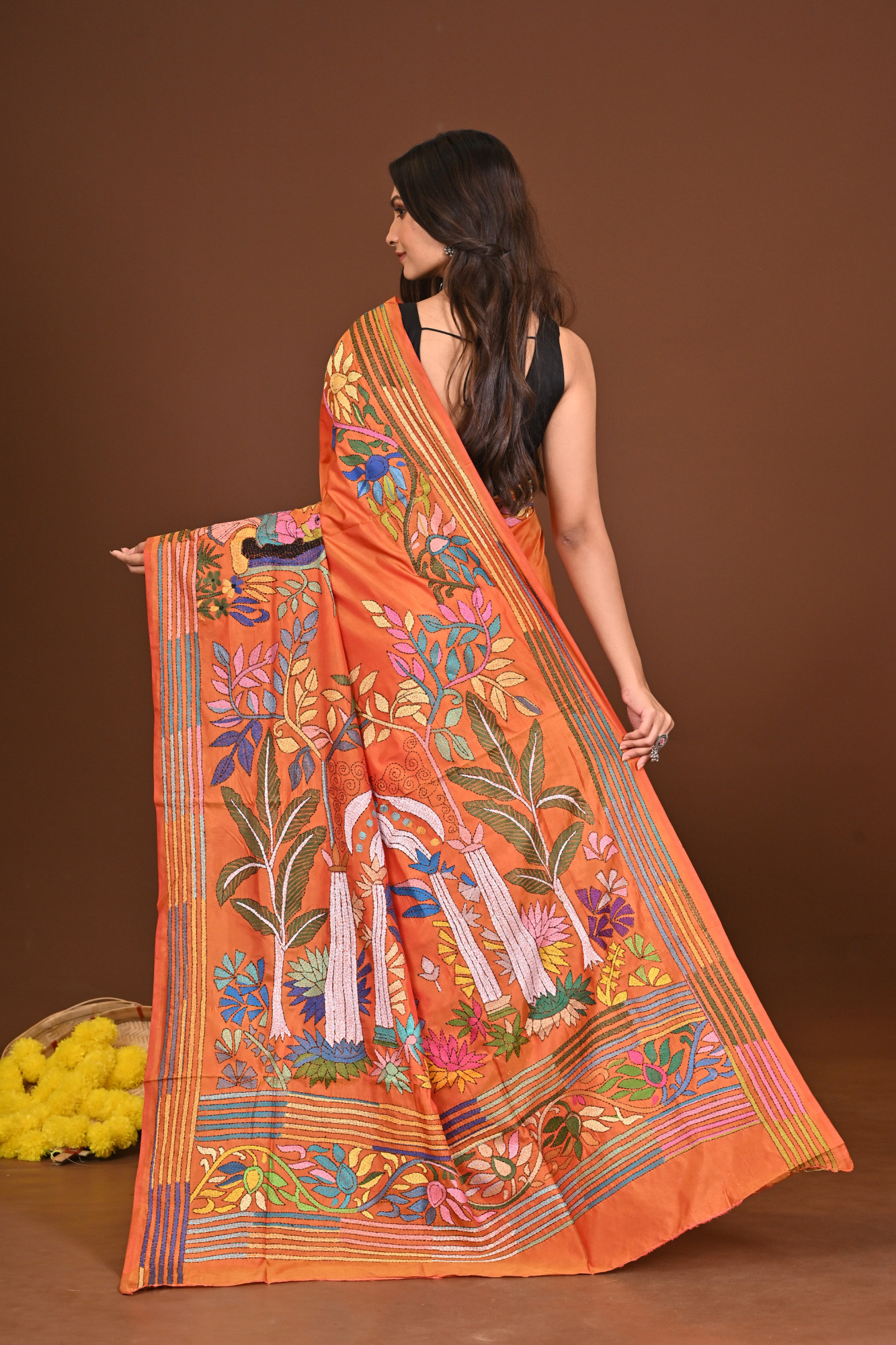 Zari : A blended silk Kantha saree is a traditional Indian saree crafted from a mix of silk and other fibers, adorned with Kantha embroidery—a hand-stitched technique originating from Bengal. These sarees are known for their lightweight drape, smooth texture, and intricate, often storytelling motifs stitched in fine running stitches. The blend of silk gives it a soft sheen and elegance, making it a perfect choice for both festive and casual occasions.