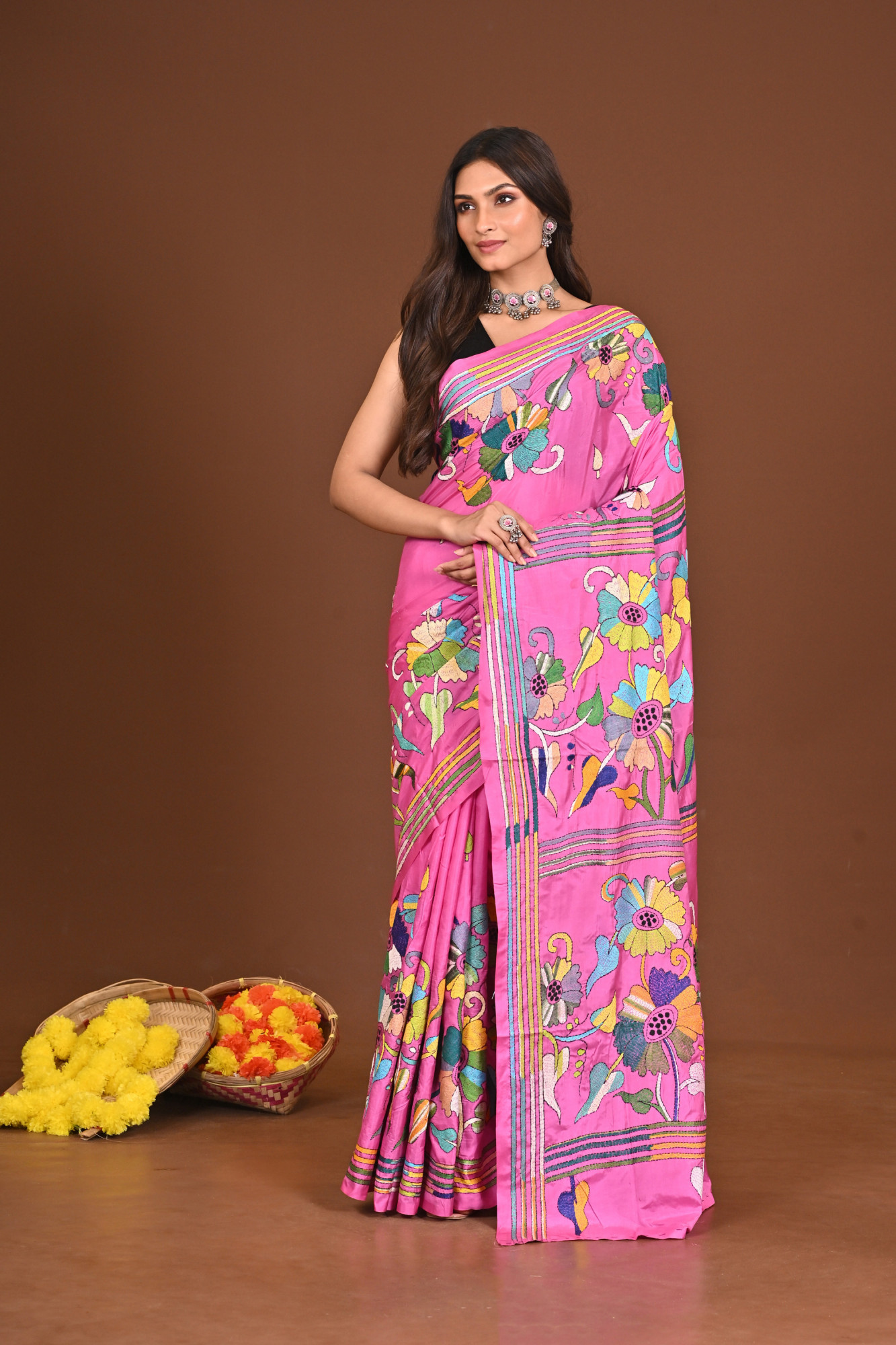 Zari : A blended silk Kantha saree is a traditional Indian saree crafted from a mix of silk and other fibers, adorned with Kantha embroidery—a hand-stitched technique originating from Bengal. These sarees are known for their lightweight drape, smooth texture, and intricate, often storytelling motifs stitched in fine running stitches. The blend of silk gives it a soft sheen and elegance, making it a perfect choice for both festive and casual occasions.