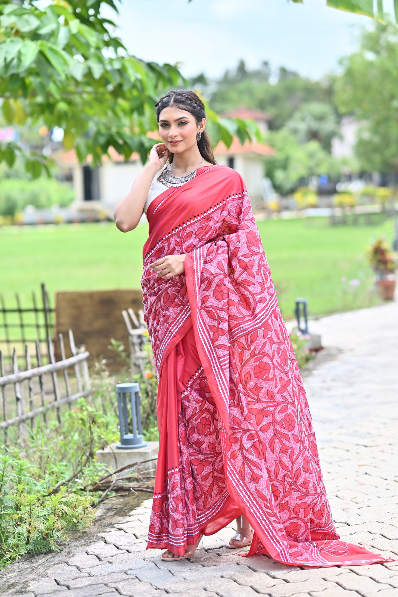 Zari : A blended silk Kantha saree is a traditional Indian saree crafted from a mix of silk and other fibers, adorned with Kantha embroidery—a hand-stitched technique originating from Bengal. These sarees are known for their lightweight drape, smooth texture, and intricate, often storytelling motifs stitched in fine running stitches. The blend of silk gives it a soft sheen and elegance, making it a perfect choice for both festive and casual occasions.