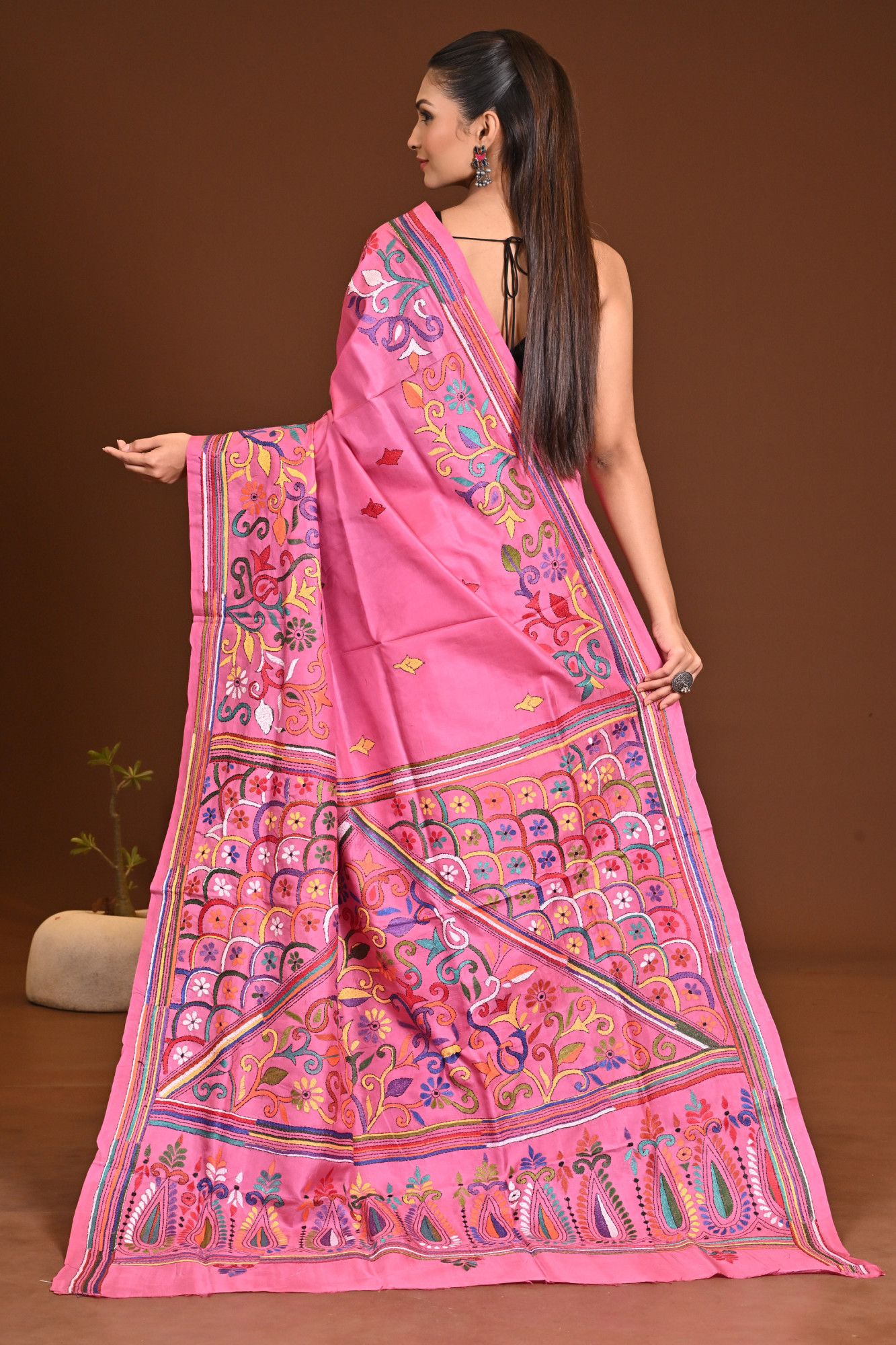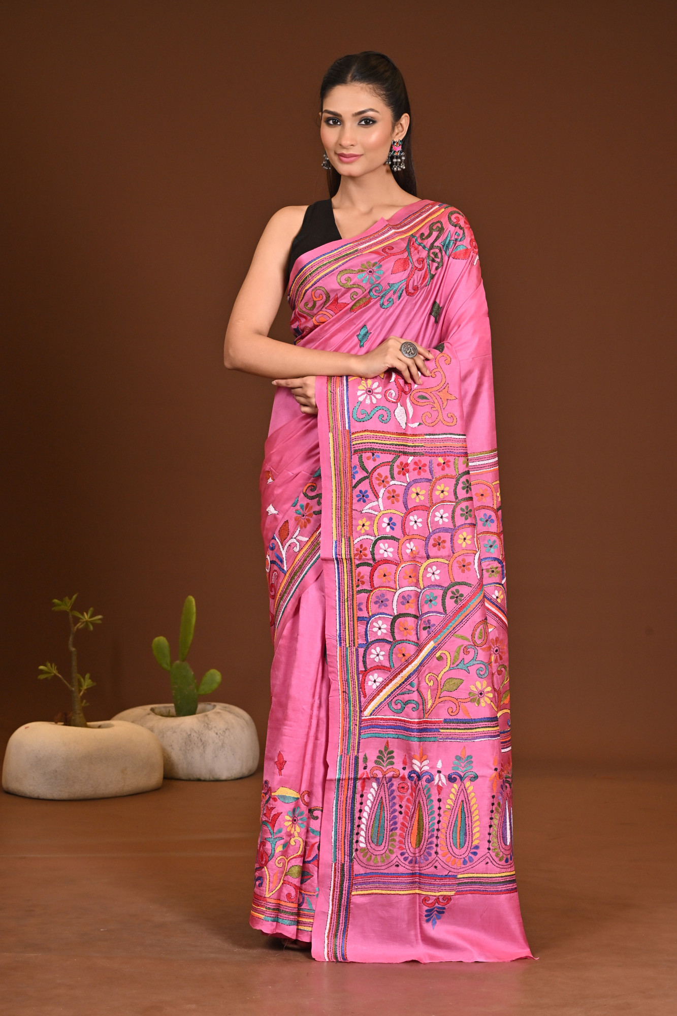 Zari : A pure silk Kantha saree is a luxurious handwoven saree made entirely from high-quality silk, featuring the traditional Kantha embroidery from Bengal. Known for its rich texture and natural sheen, the saree is adorned with intricate, hand-stitched patterns—often floral, folk, or narrative designs—created using fine running stitches. Elegant and timeless, it’s a perfect blend of heritage craftsmanship and sophistication, ideal for special occasions.