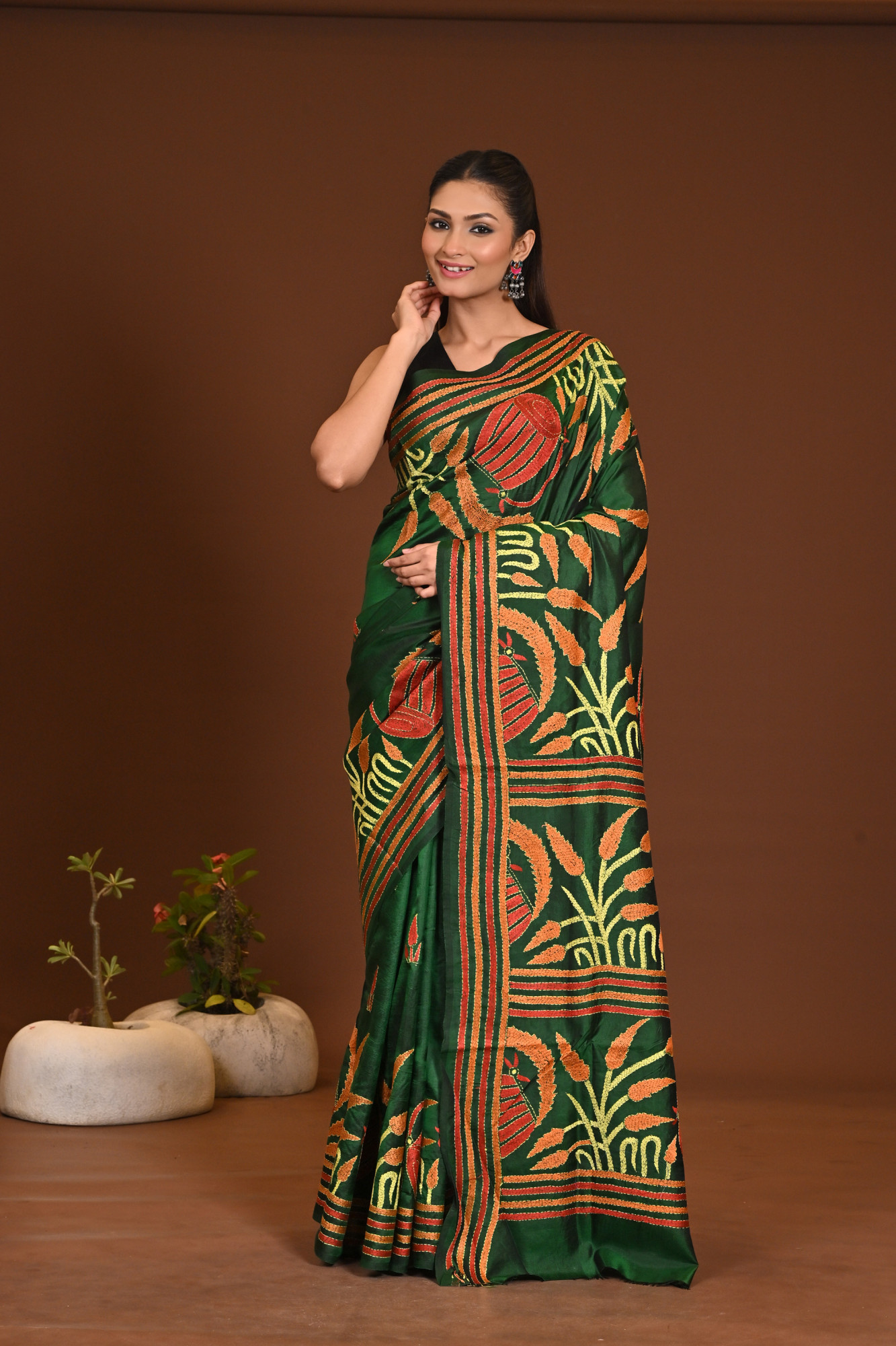 Zari : A pure silk Kantha saree is a luxurious handwoven saree made entirely from high-quality silk, featuring the traditional Kantha embroidery from Bengal. Known for its rich texture and natural sheen, the saree is adorned with intricate, hand-stitched patterns—often floral, folk, or narrative designs—created using fine running stitches. Elegant and timeless, it’s a perfect blend of heritage craftsmanship and sophistication, ideal for special occasions.