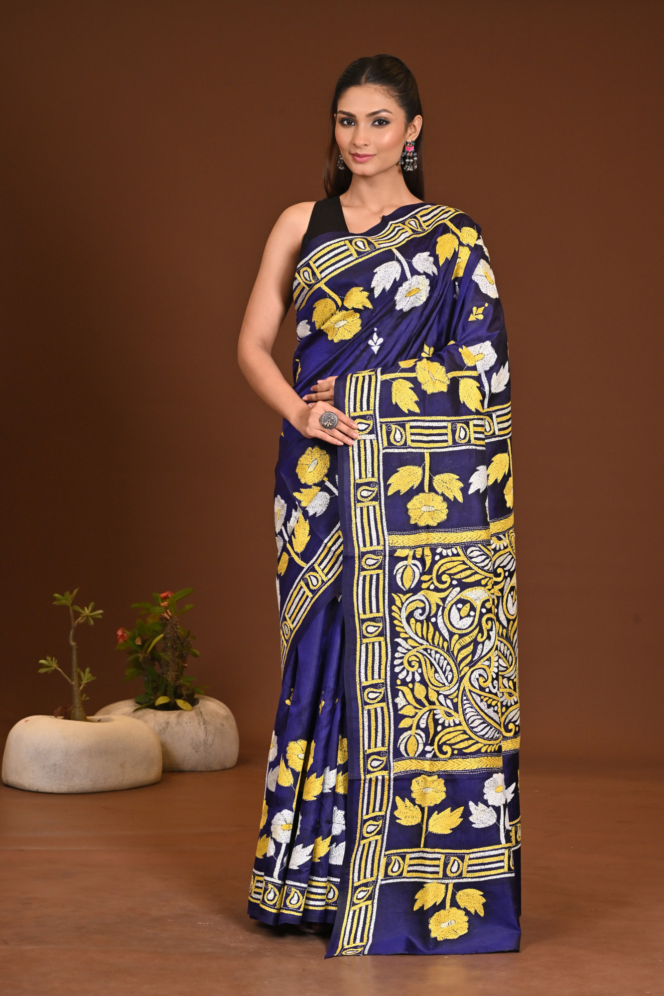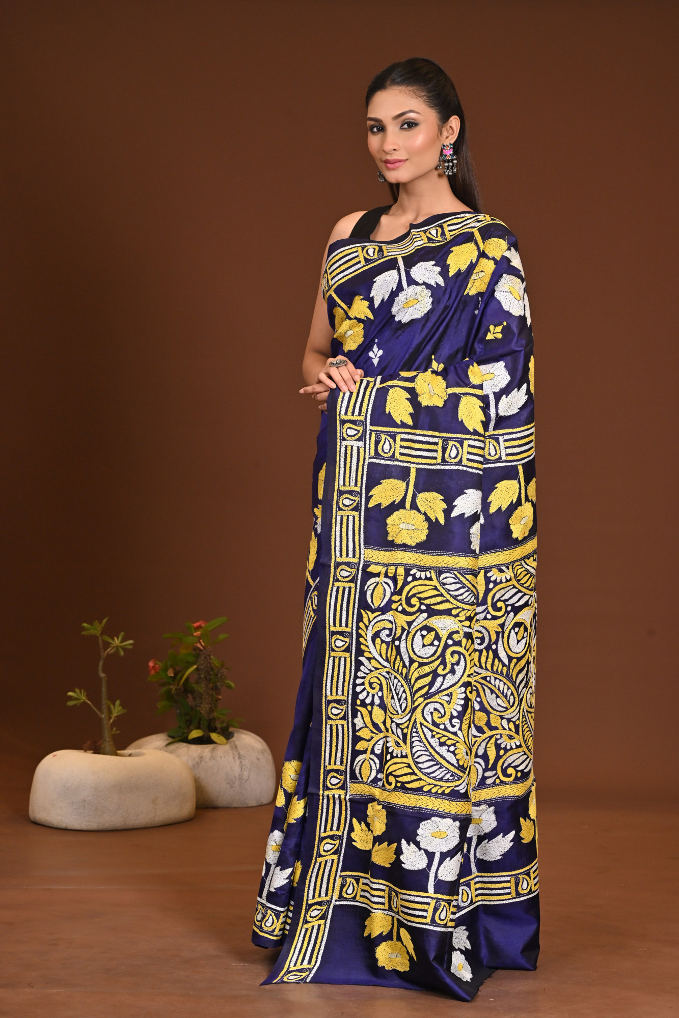 Zari : A pure silk Kantha saree is a luxurious handwoven saree made entirely from high-quality silk, featuring the traditional Kantha embroidery from Bengal. Known for its rich texture and natural sheen, the saree is adorned with intricate, hand-stitched patterns—often floral, folk, or narrative designs—created using fine running stitches. Elegant and timeless, it’s a perfect blend of heritage craftsmanship and sophistication, ideal for special occasions.
