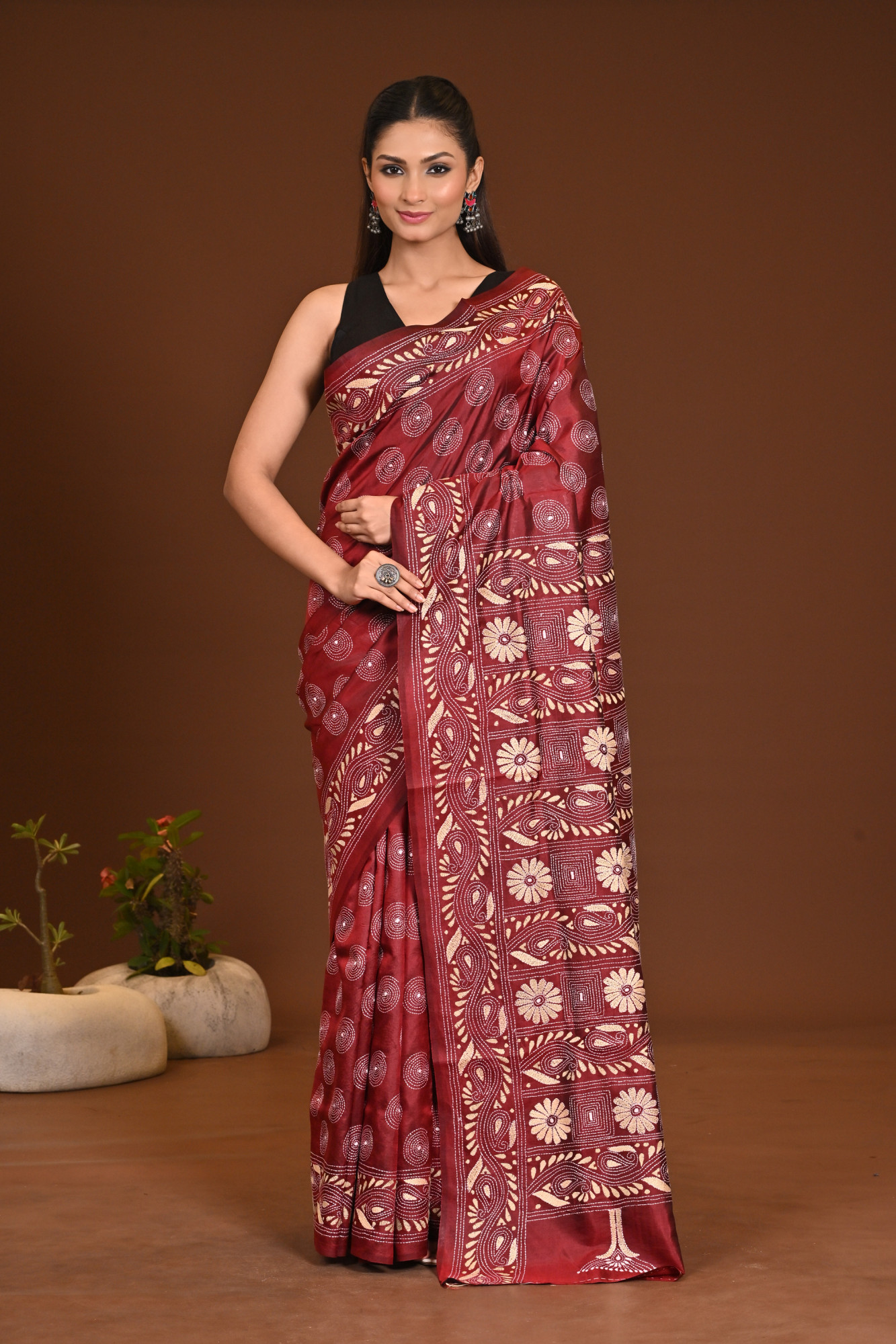 Zari : A pure silk Kantha saree is a luxurious handwoven saree made entirely from high-quality silk, featuring the traditional Kantha embroidery from Bengal. Known for its rich texture and natural sheen, the saree is adorned with intricate, hand-stitched patterns—often floral, folk, or narrative designs—created using fine running stitches. Elegant and timeless, it’s a perfect blend of heritage craftsmanship and sophistication, ideal for special occasions.