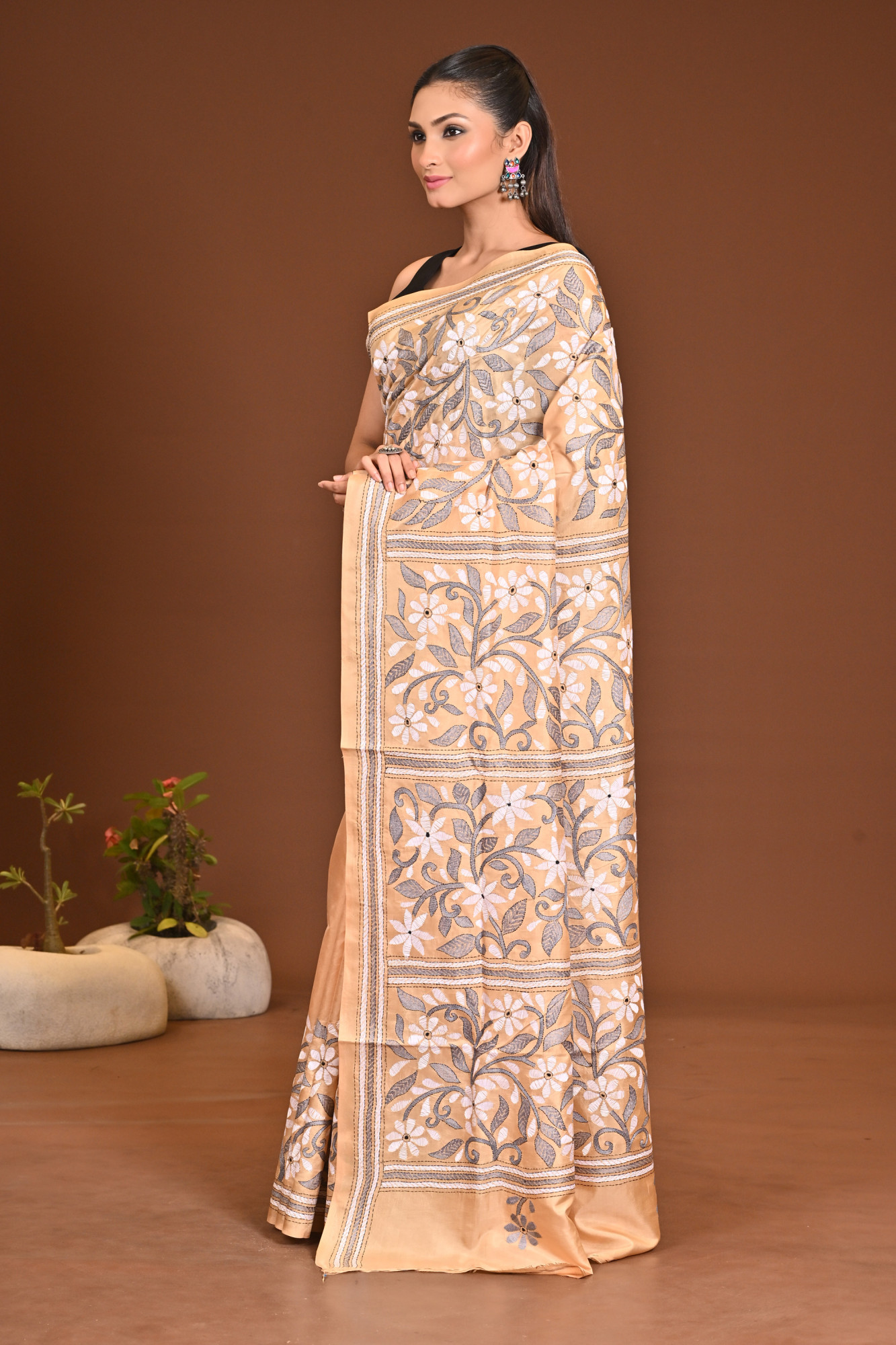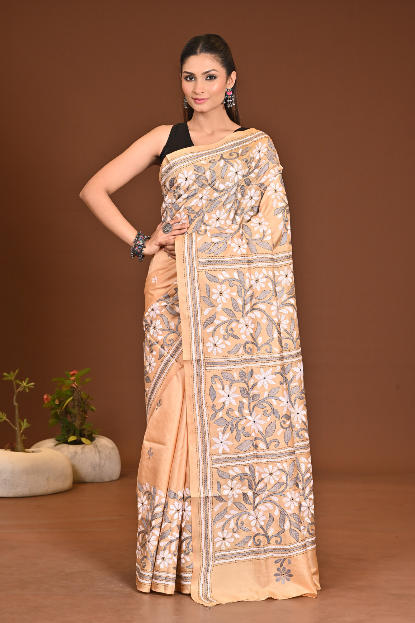 Zari : A pure silk Kantha saree is a luxurious handwoven saree made entirely from high-quality silk, featuring the traditional Kantha embroidery from Bengal. Known for its rich texture and natural sheen, the saree is adorned with intricate, hand-stitched patterns—often floral, folk, or narrative designs—created using fine running stitches. Elegant and timeless, it’s a perfect blend of heritage craftsmanship and sophistication, ideal for special occasions.