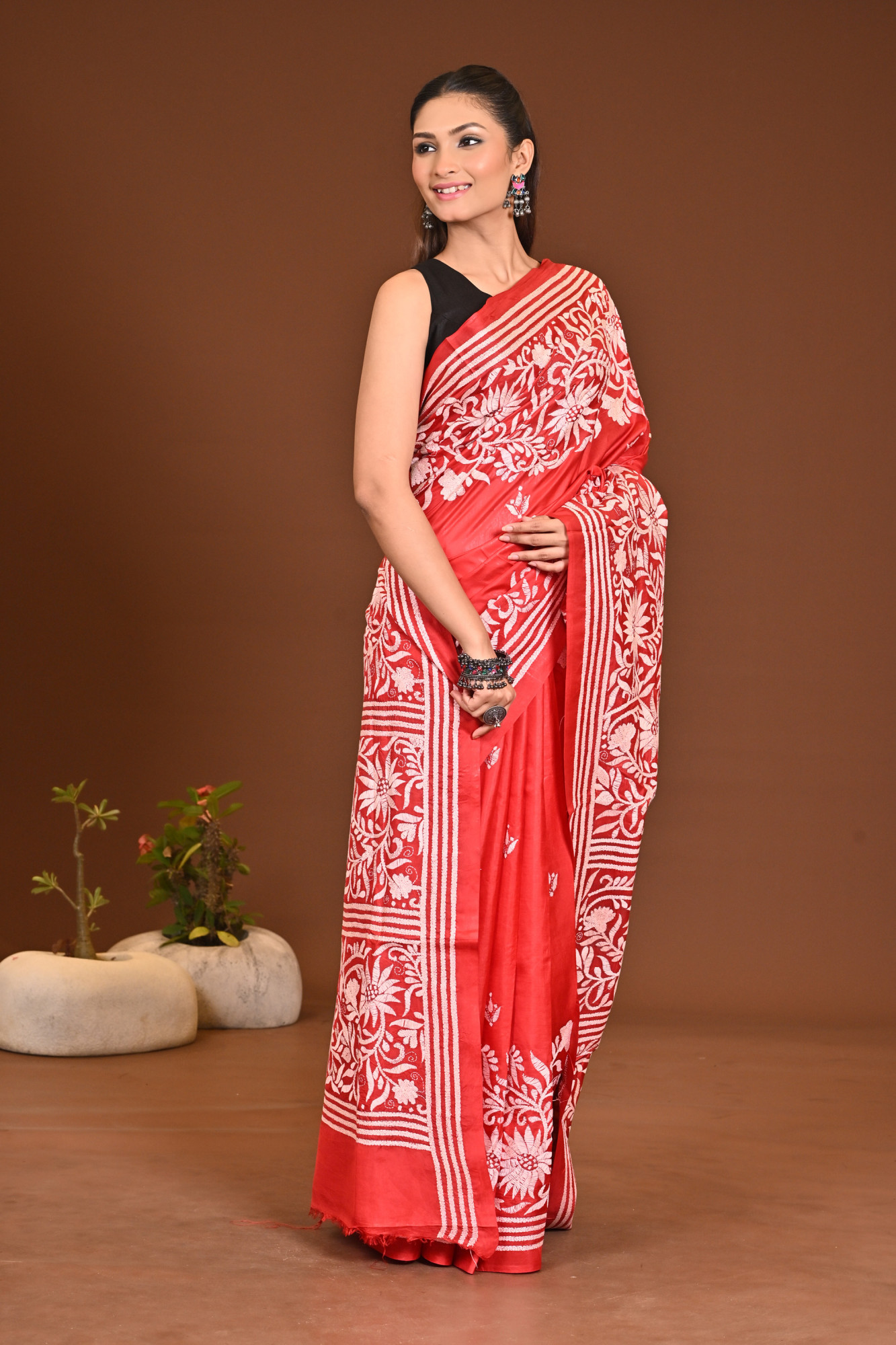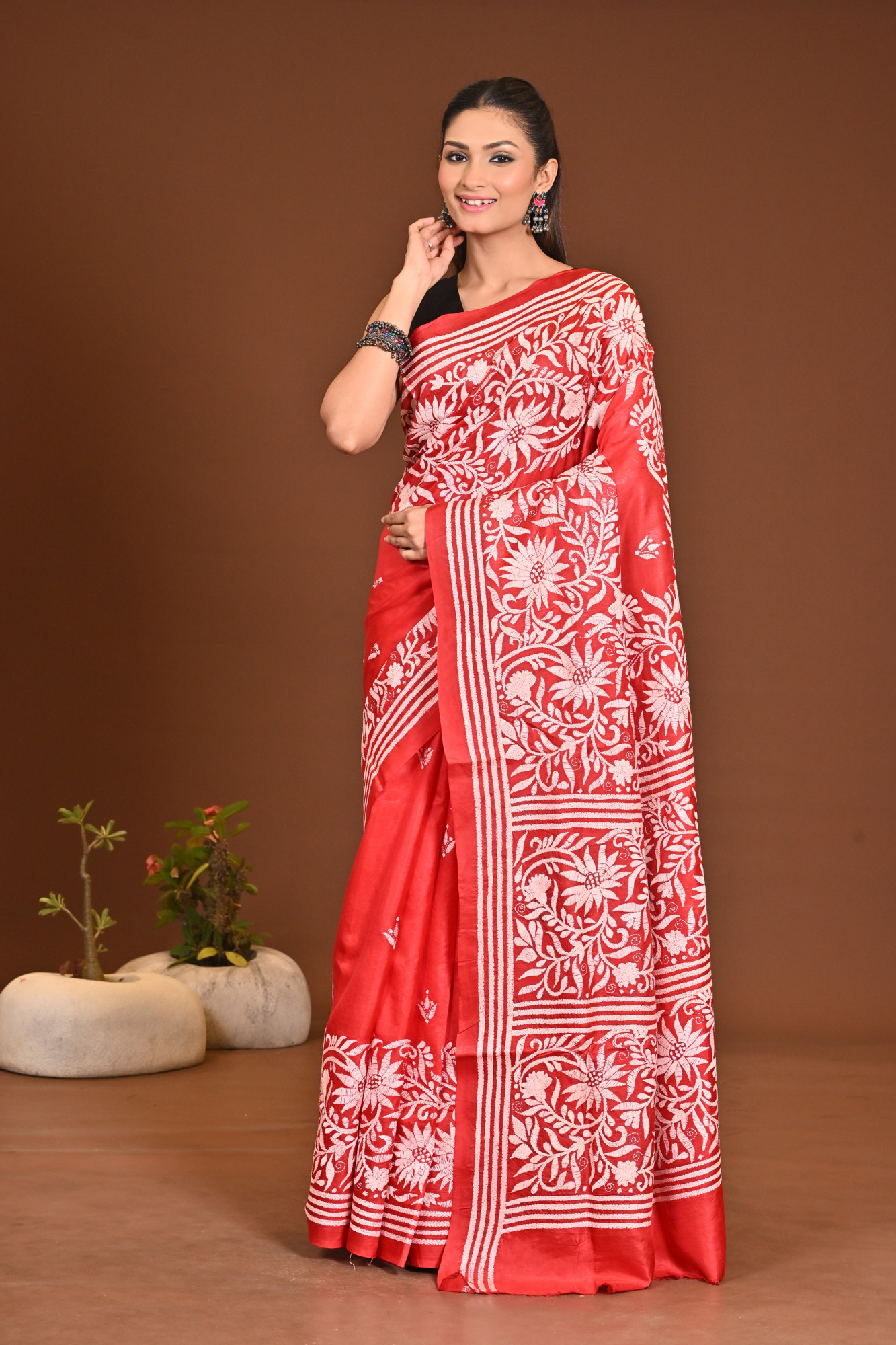Zari : A pure silk Kantha saree is a luxurious handwoven saree made entirely from high-quality silk, featuring the traditional Kantha embroidery from Bengal. Known for its rich texture and natural sheen, the saree is adorned with intricate, hand-stitched patterns—often floral, folk, or narrative designs—created using fine running stitches. Elegant and timeless, it’s a perfect blend of heritage craftsmanship and sophistication, ideal for special occasions.