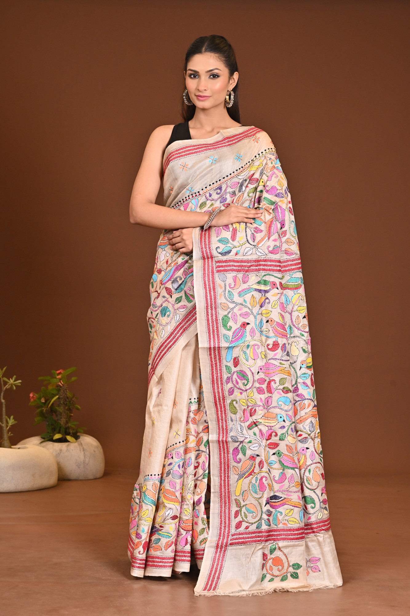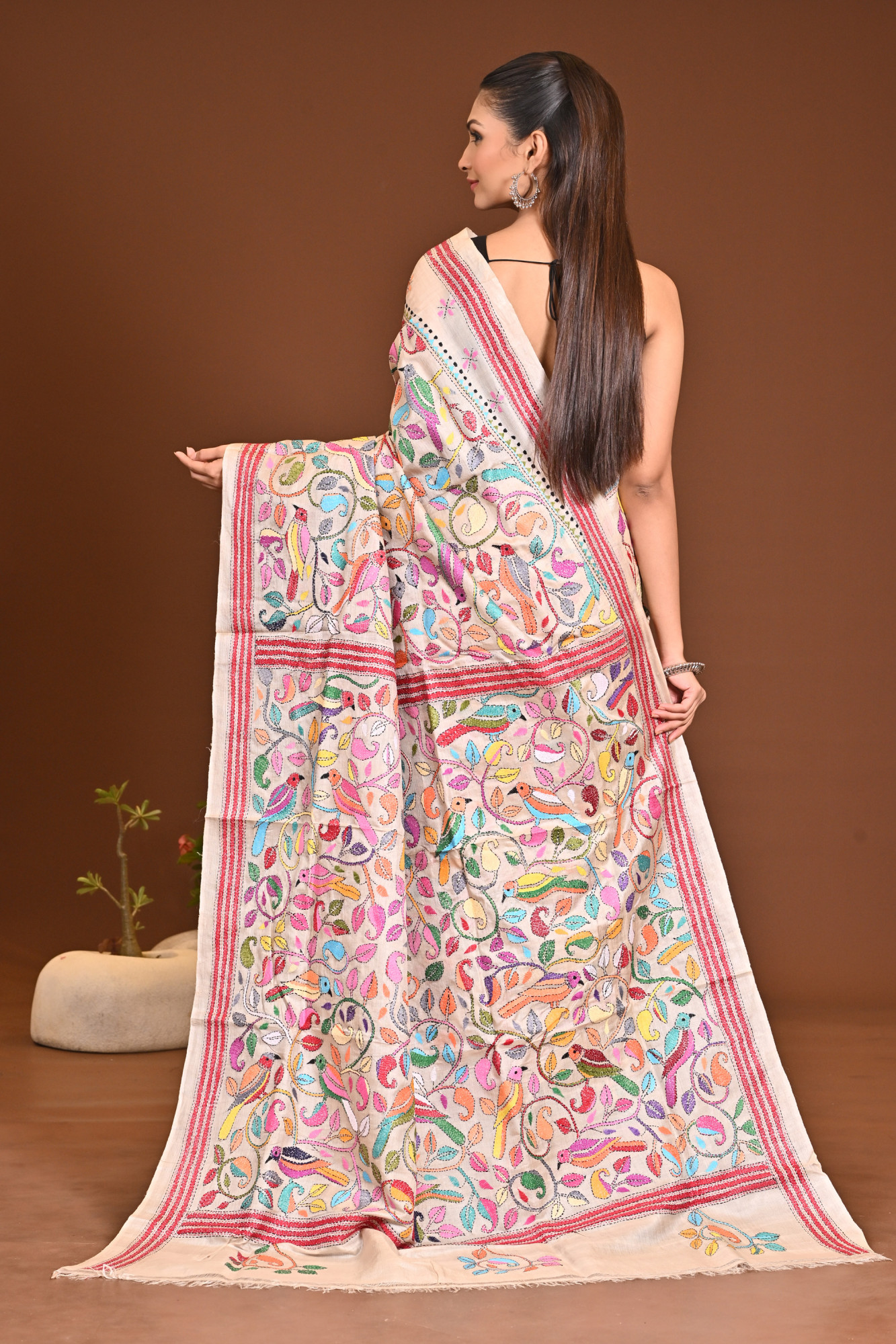 Zari : A pure silk Kantha saree is a luxurious handwoven saree made entirely from high-quality silk, featuring the traditional Kantha embroidery from Bengal. Known for its rich texture and natural sheen, the saree is adorned with intricate, hand-stitched patterns—often floral, folk, or narrative designs—created using fine running stitches. Elegant and timeless, it’s a perfect blend of heritage craftsmanship and sophistication, ideal for special occasions.