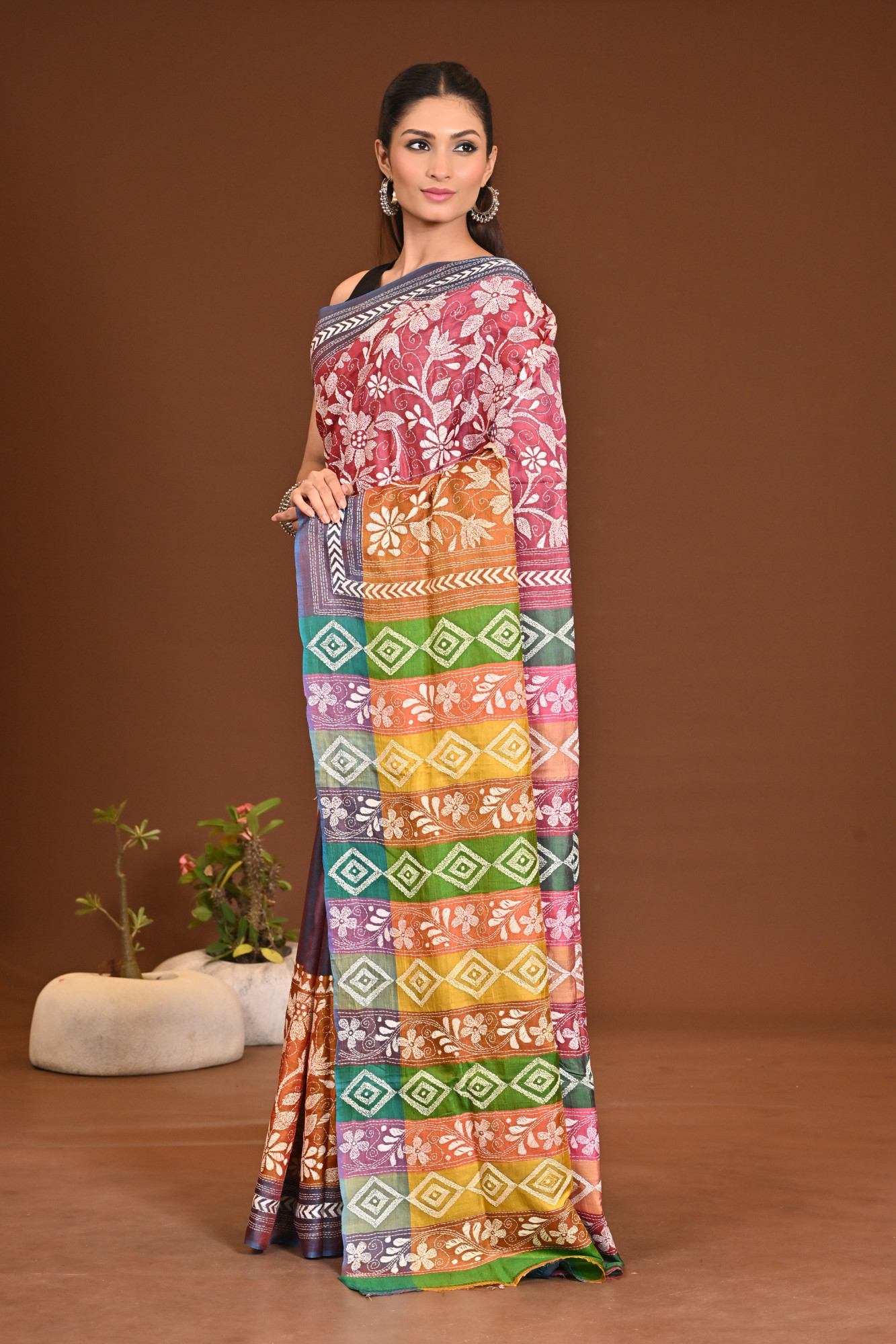 Zari : A pure silk Kantha saree is a luxurious handwoven saree made entirely from high-quality silk, featuring the traditional Kantha embroidery from Bengal. Known for its rich texture and natural sheen, the saree is adorned with intricate, hand-stitched patterns—often floral, folk, or narrative designs—created using fine running stitches. Elegant and timeless, it’s a perfect blend of heritage craftsmanship and sophistication, ideal for special occasions.