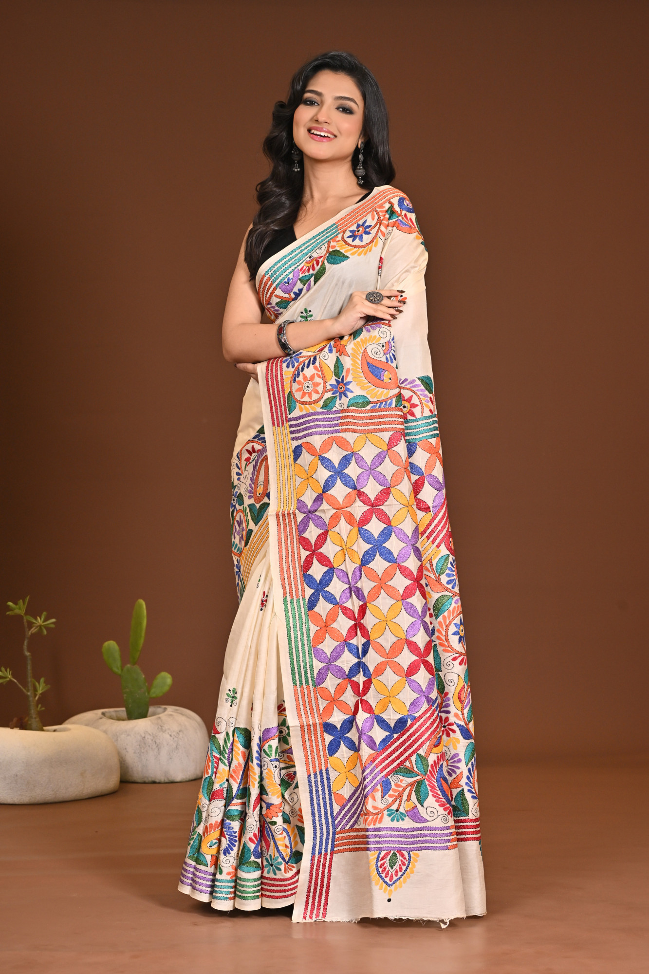 Zari : A pure silk Kantha saree is a luxurious handwoven saree made entirely from high-quality silk, featuring the traditional Kantha embroidery from Bengal. Known for its rich texture and natural sheen, the saree is adorned with intricate, hand-stitched patterns—often floral, folk, or narrative designs—created using fine running stitches. Elegant and timeless, it’s a perfect blend of heritage craftsmanship and sophistication, ideal for special occasions.