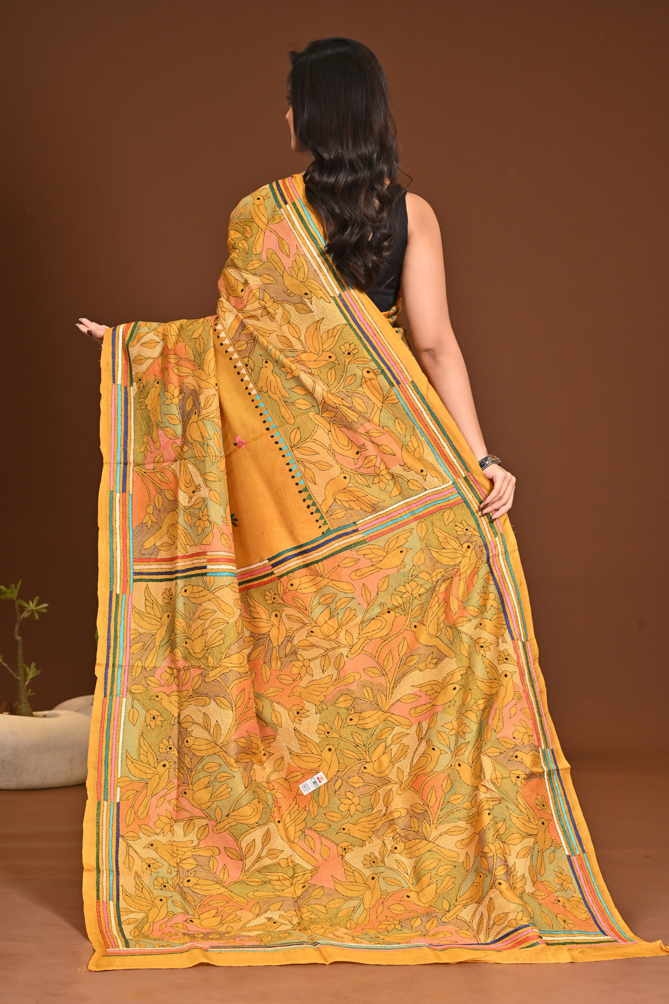 Zari : A pure silk Kantha saree is a luxurious handwoven saree made entirely from high-quality silk, featuring the traditional Kantha embroidery from Bengal. Known for its rich texture and natural sheen, the saree is adorned with intricate, hand-stitched patterns—often floral, folk, or narrative designs—created using fine running stitches. Elegant and timeless, it’s a perfect blend of heritage craftsmanship and sophistication, ideal for special occasions.
