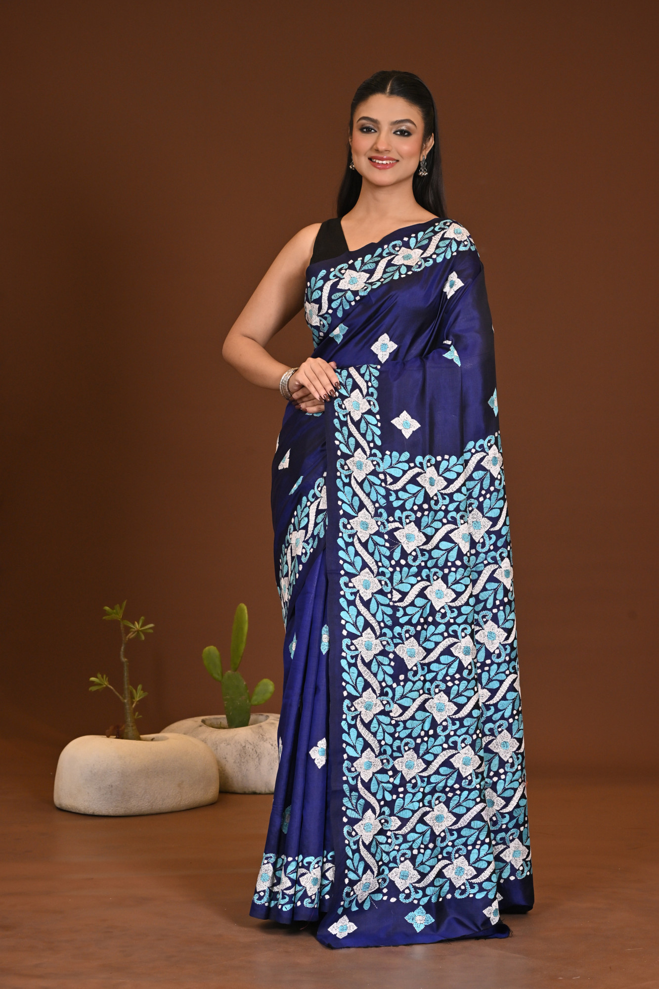 Zari : A pure silk Kantha saree is a luxurious handwoven saree made entirely from high-quality silk, featuring the traditional Kantha embroidery from Bengal. Known for its rich texture and natural sheen, the saree is adorned with intricate, hand-stitched patterns—often floral, folk, or narrative designs—created using fine running stitches. Elegant and timeless, it’s a perfect blend of heritage craftsmanship and sophistication, ideal for special occasions.