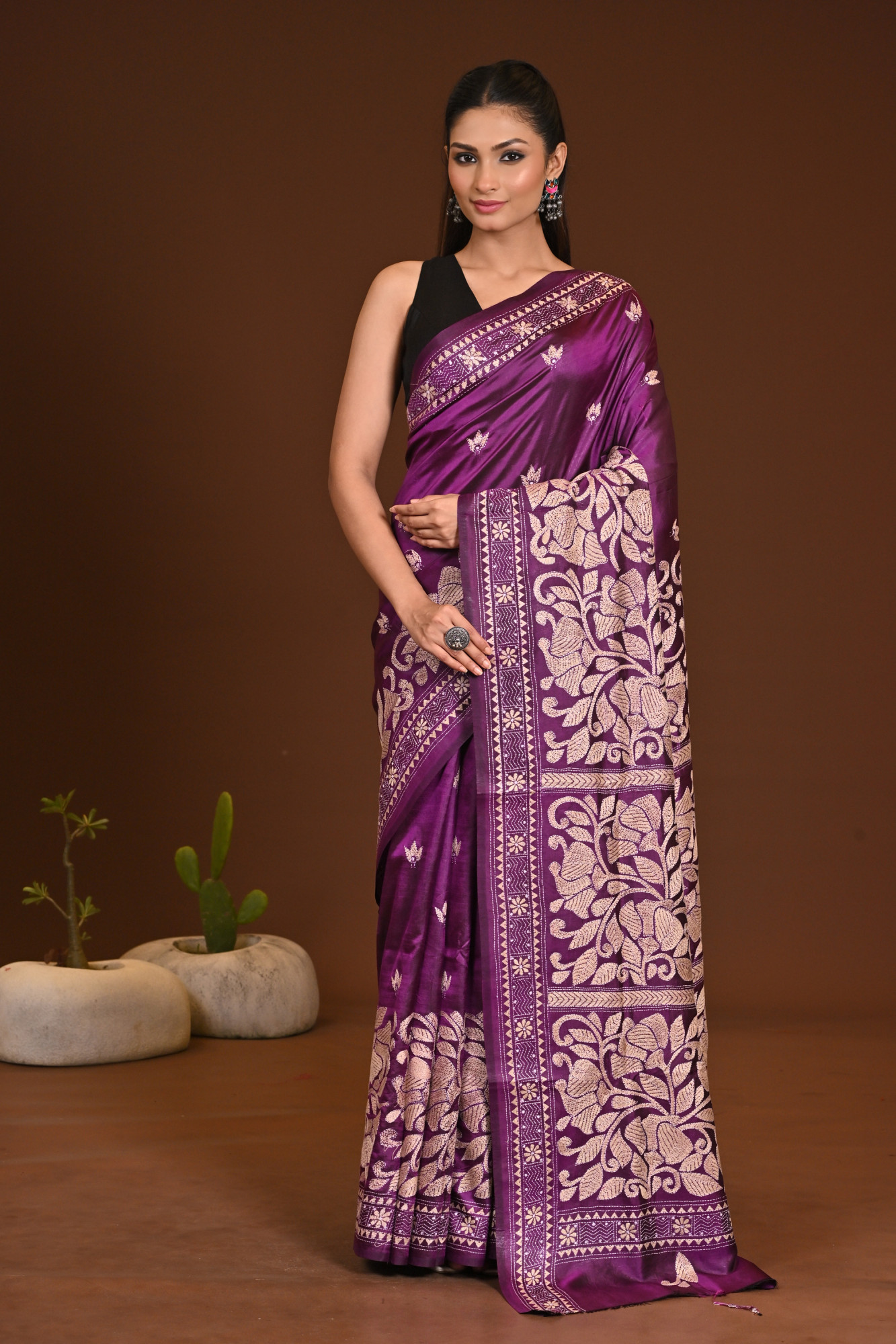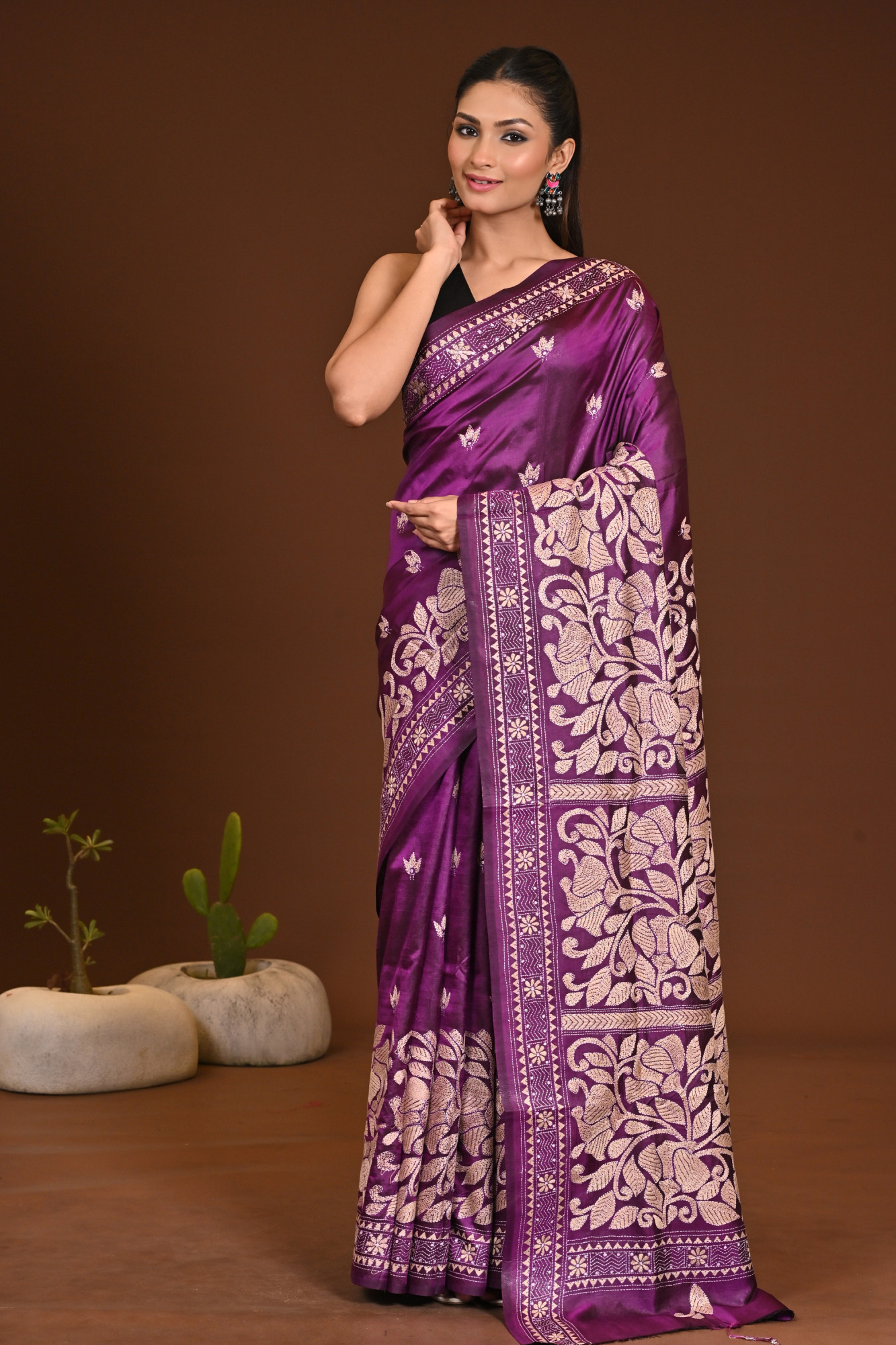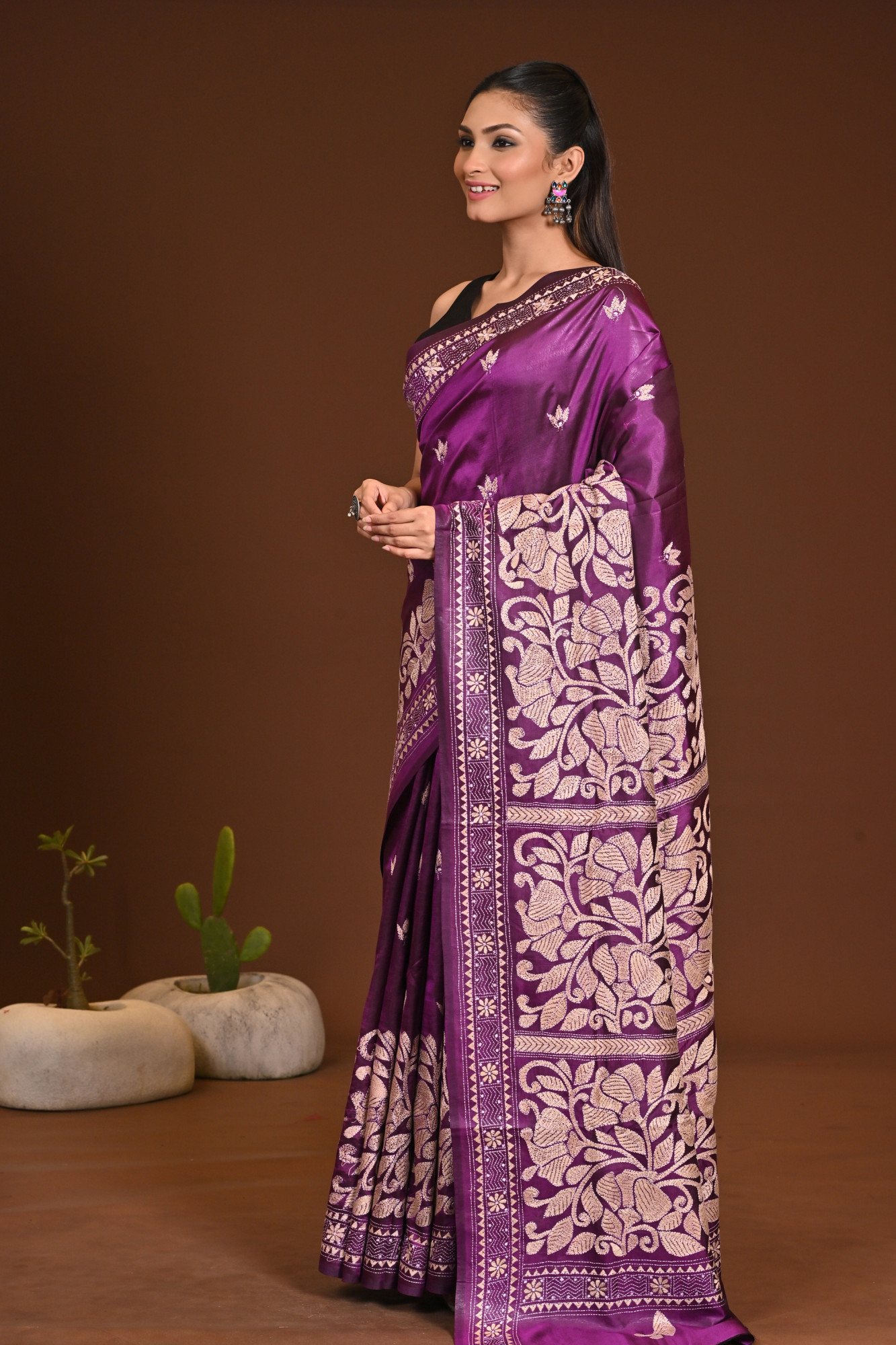 Zari : A pure silk Kantha saree is a luxurious handwoven saree made entirely from high-quality silk, featuring the traditional Kantha embroidery from Bengal. Known for its rich texture and natural sheen, the saree is adorned with intricate, hand-stitched patterns—often floral, folk, or narrative designs—created using fine running stitches. Elegant and timeless, it’s a perfect blend of heritage craftsmanship and sophistication, ideal for special occasions.