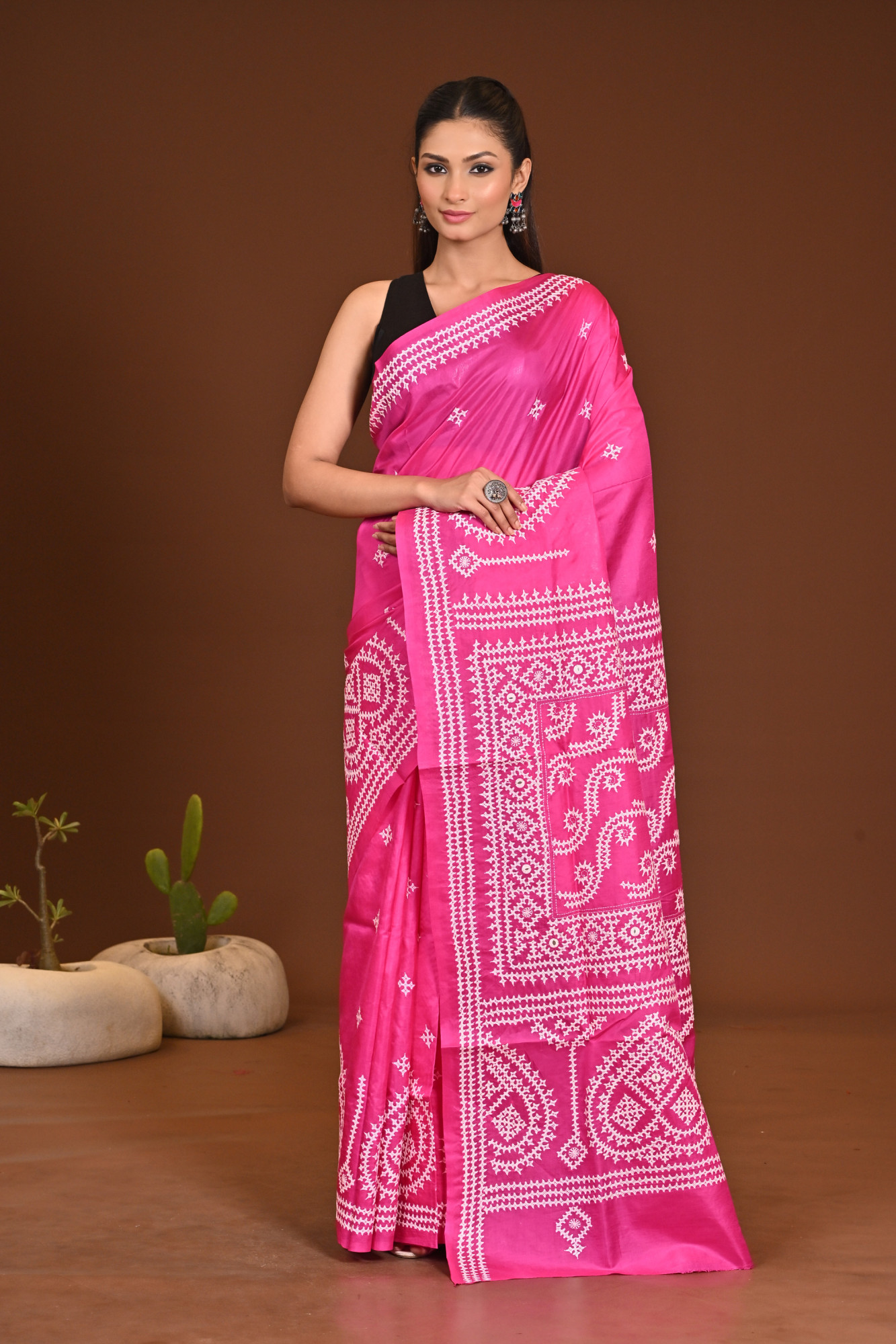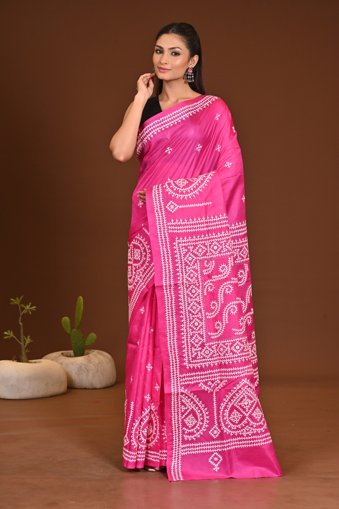 Zari : A pure silk Kantha saree is a luxurious handwoven saree made entirely from high-quality silk, featuring the traditional Kantha embroidery from Bengal. Known for its rich texture and natural sheen, the saree is adorned with intricate, hand-stitched patterns—often floral, folk, or narrative designs—created using fine running stitches. Elegant and timeless, it’s a perfect blend of heritage craftsmanship and sophistication, ideal for special occasions.