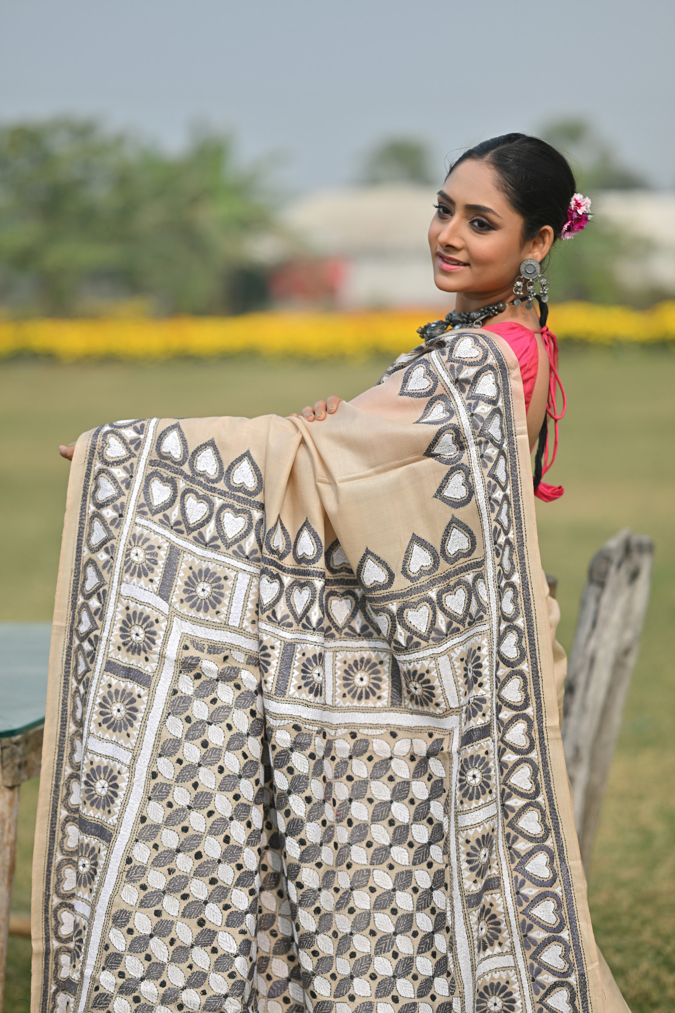 Zari : A pure silk Kantha saree is a luxurious handwoven saree made entirely from high-quality silk, featuring the traditional Kantha embroidery from Bengal. Known for its rich texture and natural sheen, the saree is adorned with intricate, hand-stitched patterns—often floral, folk, or narrative designs—created using fine running stitches. Elegant and timeless, it’s a perfect blend of heritage craftsmanship and sophistication, ideal for special occasions.
