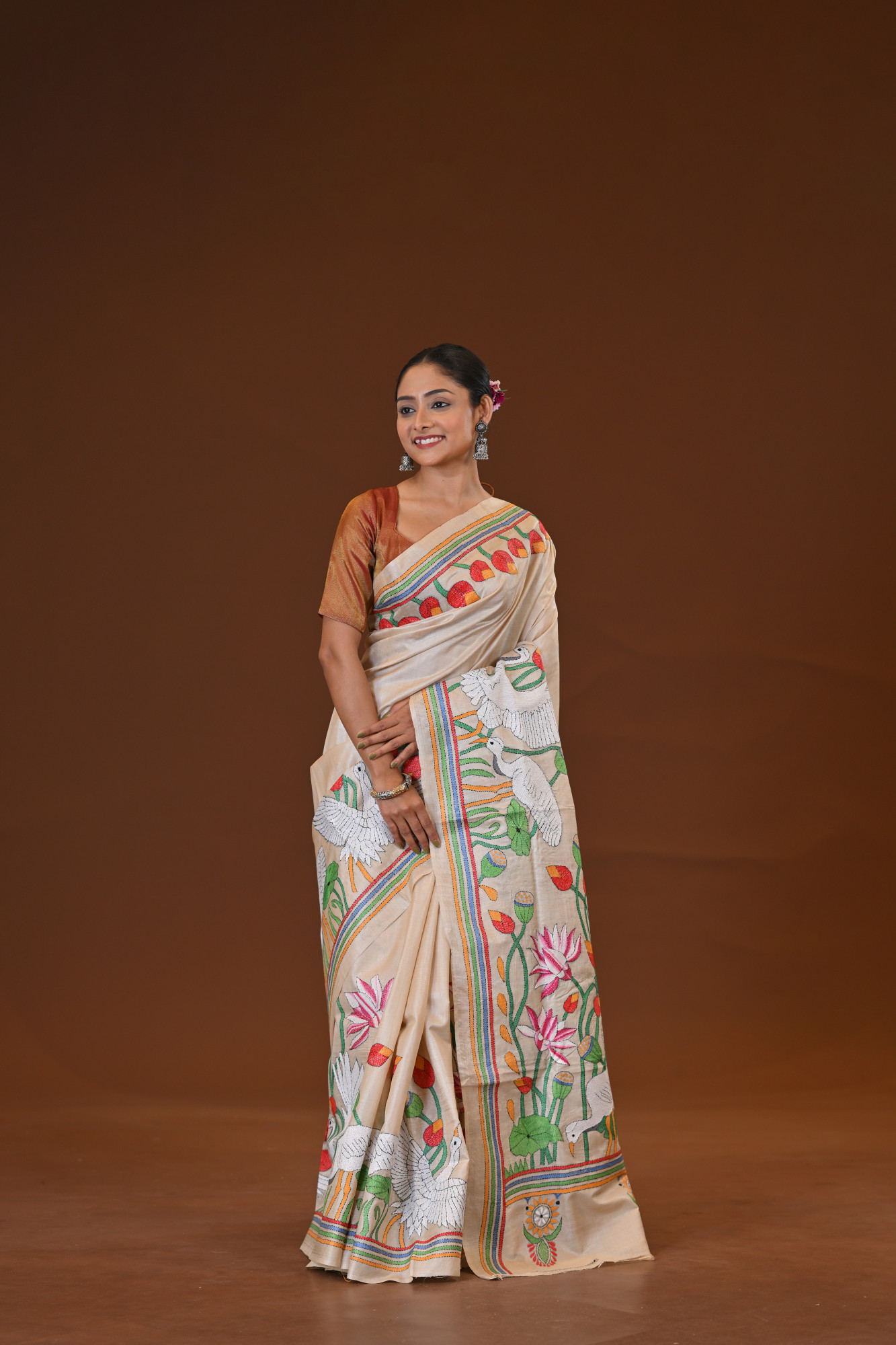 Zari : A pure silk Kantha saree is a luxurious handwoven saree made entirely from high-quality silk, featuring the traditional Kantha embroidery from Bengal. Known for its rich texture and natural sheen, the saree is adorned with intricate, hand-stitched patterns—often floral, folk, or narrative designs—created using fine running stitches. Elegant and timeless, it’s a perfect blend of heritage craftsmanship and sophistication, ideal for special occasions.