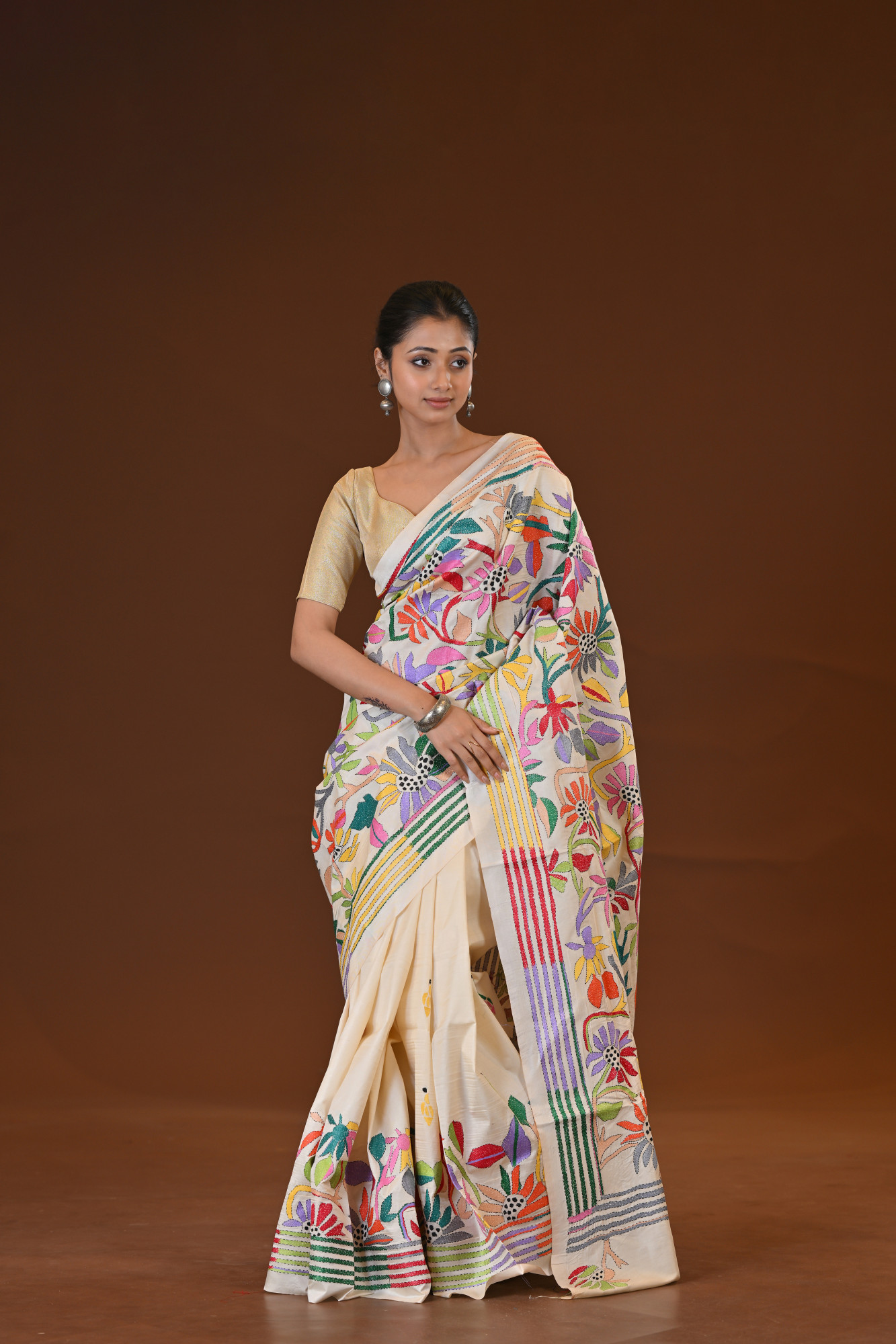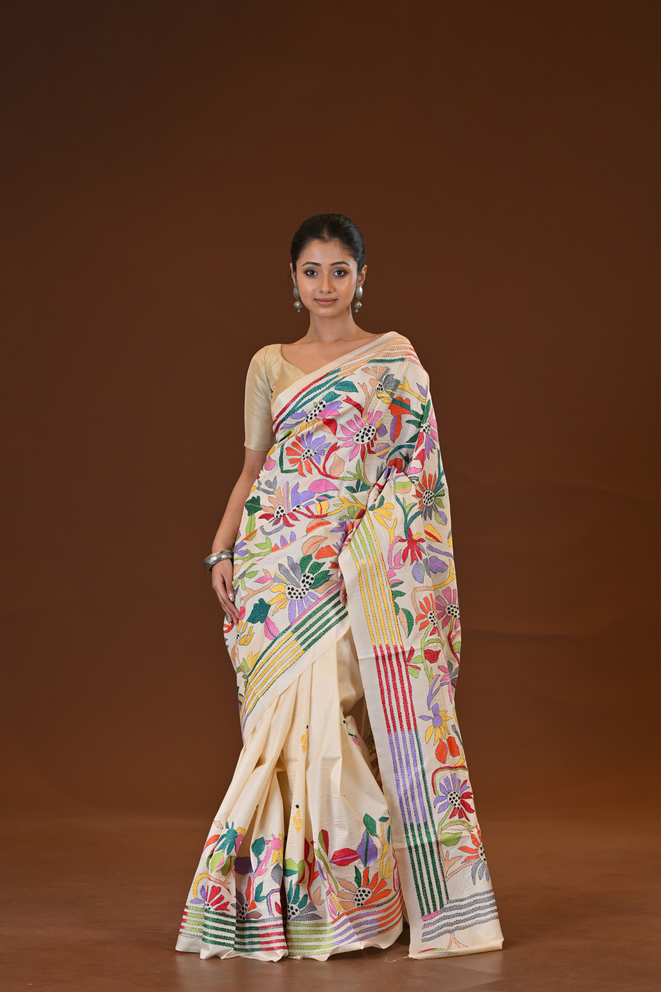 Zari : A pure silk Kantha saree is a luxurious handwoven saree made entirely from high-quality silk, featuring the traditional Kantha embroidery from Bengal. Known for its rich texture and natural sheen, the saree is adorned with intricate, hand-stitched patterns—often floral, folk, or narrative designs—created using fine running stitches. Elegant and timeless, it’s a perfect blend of heritage craftsmanship and sophistication, ideal for special occasions.