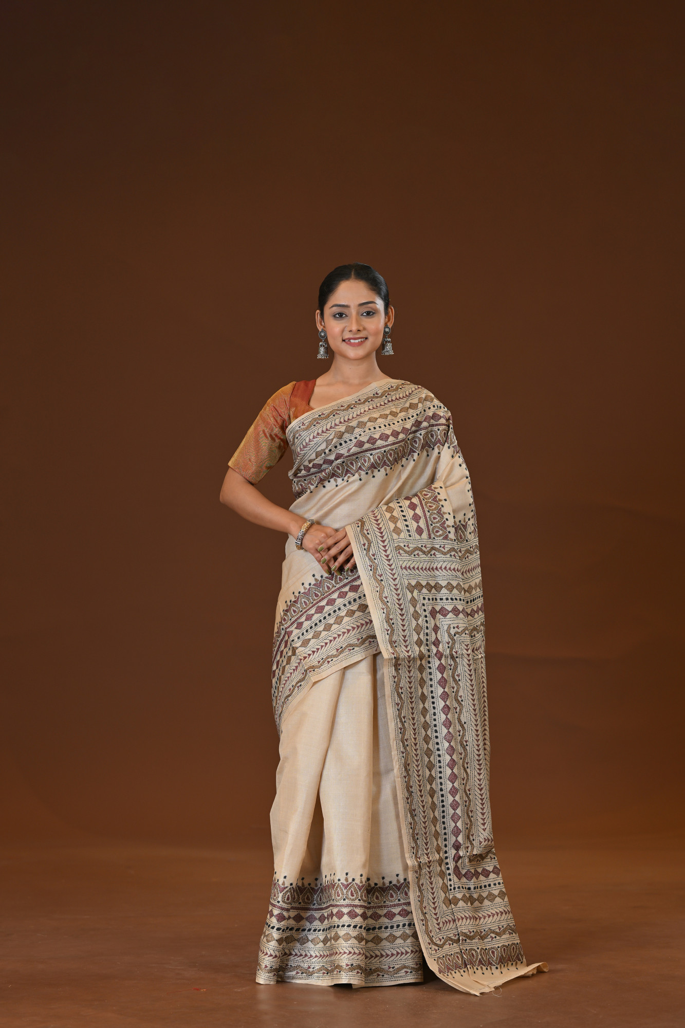 Zari : A pure silk Kantha saree is a luxurious handwoven saree made entirely from high-quality silk, featuring the traditional Kantha embroidery from Bengal. Known for its rich texture and natural sheen, the saree is adorned with intricate, hand-stitched patterns—often floral, folk, or narrative designs—created using fine running stitches. Elegant and timeless, it’s a perfect blend of heritage craftsmanship and sophistication, ideal for special occasions.