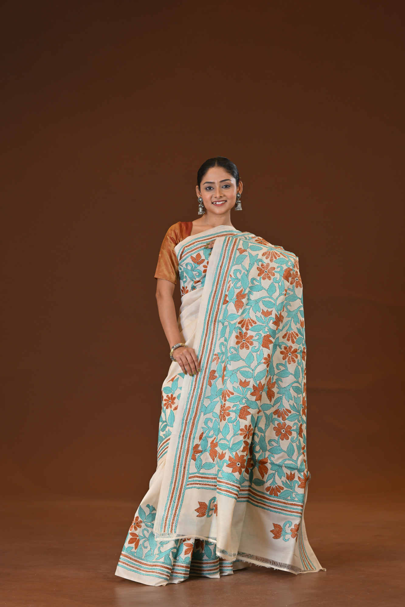 Zari : A pure silk Kantha saree is a luxurious handwoven saree made entirely from high-quality silk, featuring the traditional Kantha embroidery from Bengal. Known for its rich texture and natural sheen, the saree is adorned with intricate, hand-stitched patterns—often floral, folk, or narrative designs—created using fine running stitches. Elegant and timeless, it’s a perfect blend of heritage craftsmanship and sophistication, ideal for special occasions.