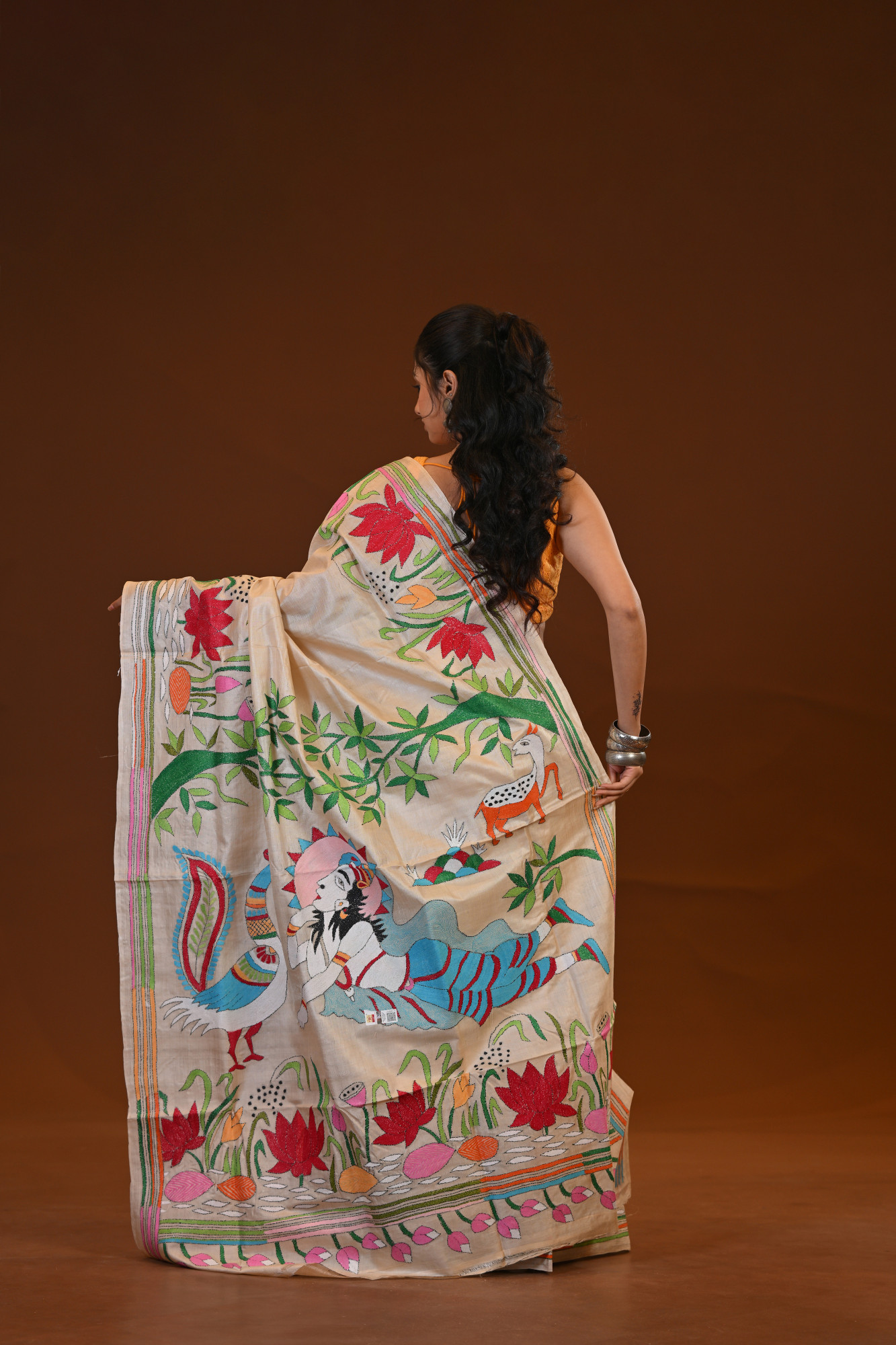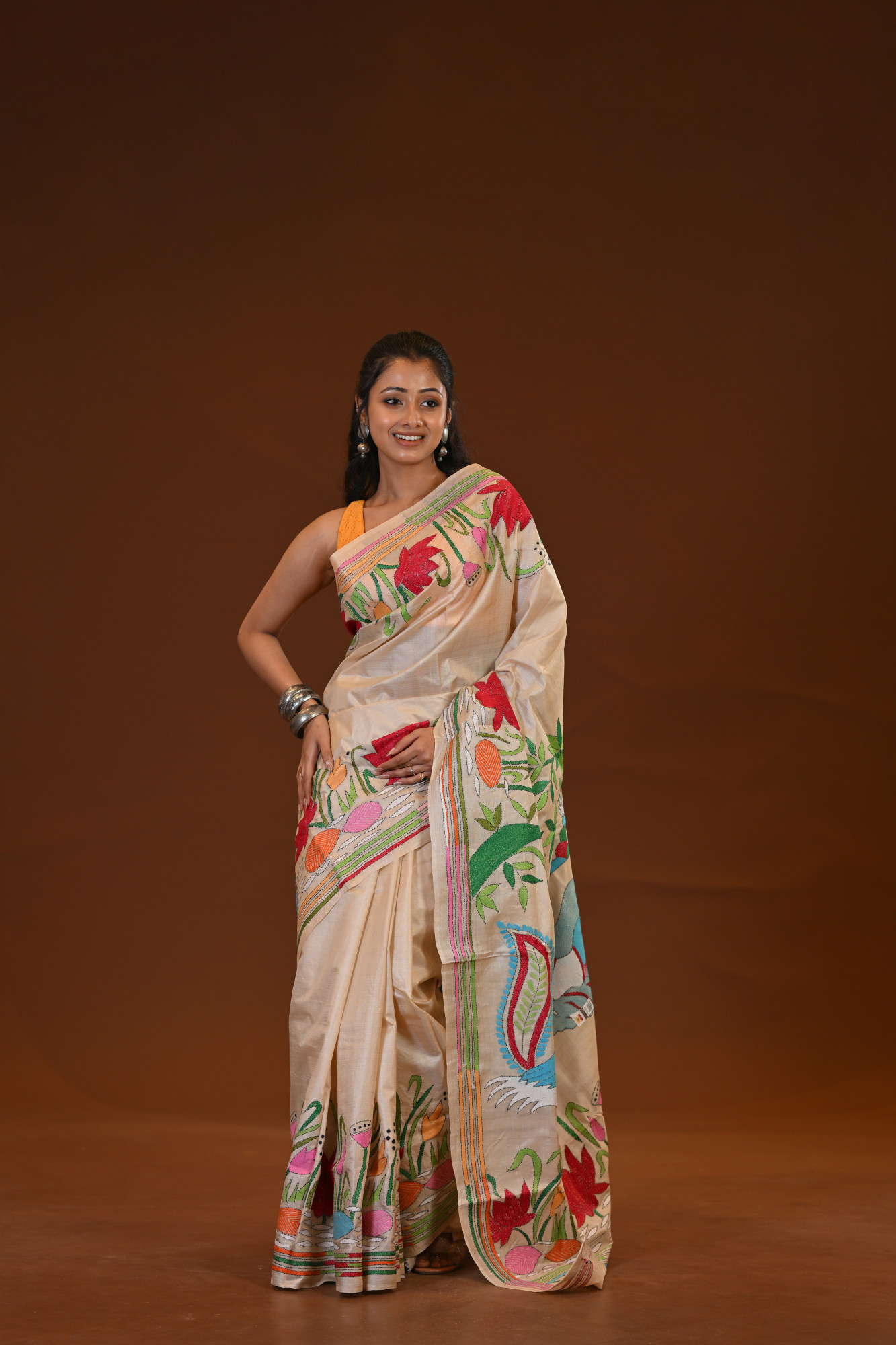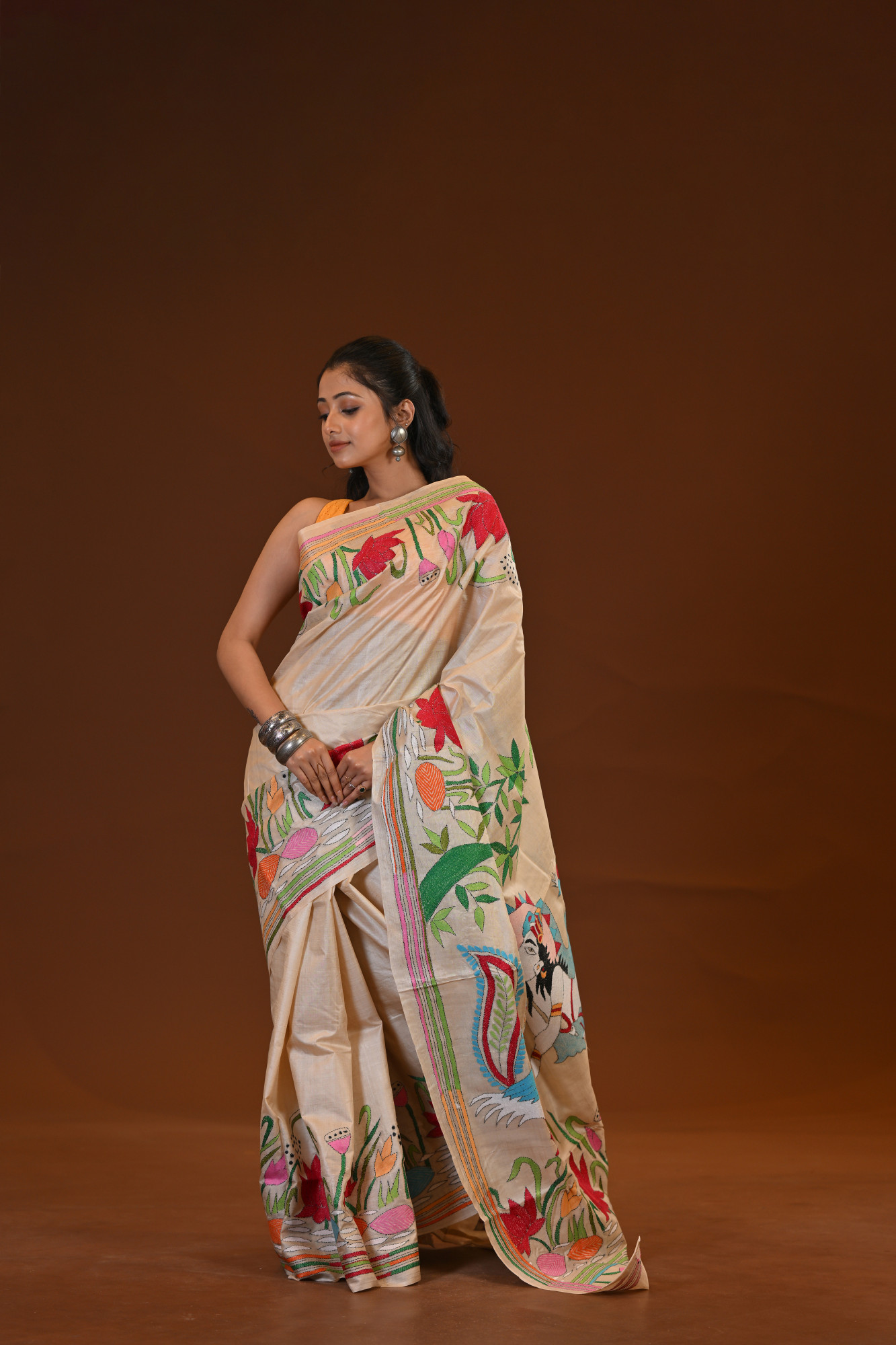 Zari : A pure silk Kantha saree is a luxurious handwoven saree made entirely from high-quality silk, featuring the traditional Kantha embroidery from Bengal. Known for its rich texture and natural sheen, the saree is adorned with intricate, hand-stitched patterns—often floral, folk, or narrative designs—created using fine running stitches. Elegant and timeless, it’s a perfect blend of heritage craftsmanship and sophistication, ideal for special occasions.