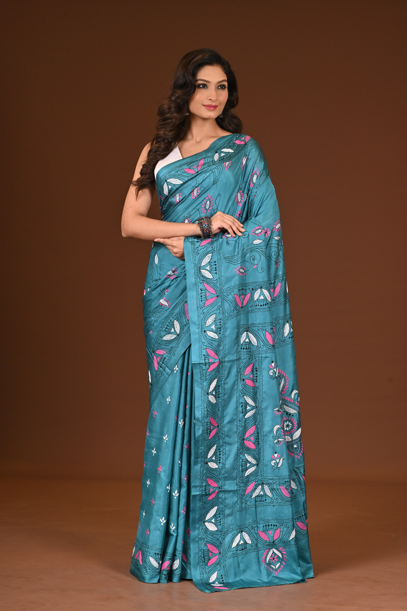 Zari : A blended silk Kantha saree is a traditional Indian saree crafted from a mix of silk and other fibers, adorned with Kantha embroidery—a hand-stitched technique originating from Bengal. These sarees are known for their lightweight drape, smooth texture, and intricate, often storytelling motifs stitched in fine running stitches. The blend of silk gives it a soft sheen and elegance, making it a perfect choice for both festive and casual occasions.
